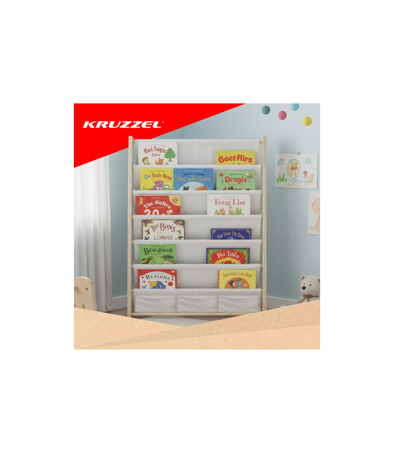 Lekki, stabilny i bezpieczny regał dziecięcy Kruzzel pomaga utrzymać porządek w książkach, kolorowankach i skarbach malucha. Wysokość dopasowana do dziecka ułatwia samodzielny dostęp i zachęca do czytania. Drewniana konstrukcja z materiałowymi półkami łączy estetykę z funkcjonalnością, pasując do nowoczesnych i klasycznych wnętrz.