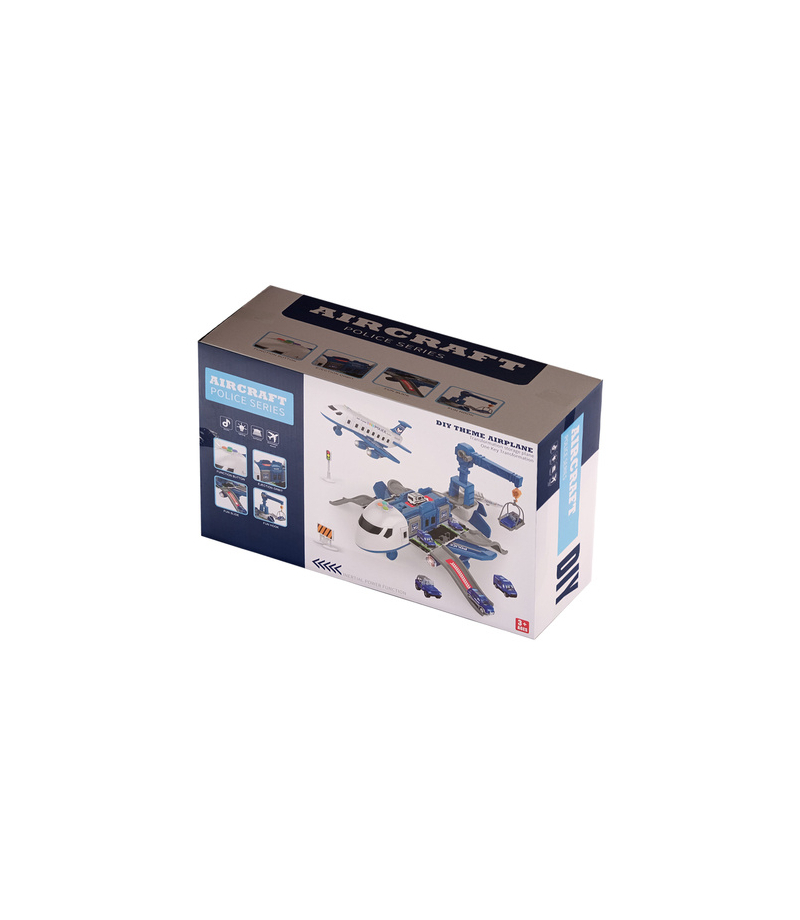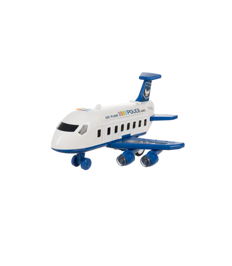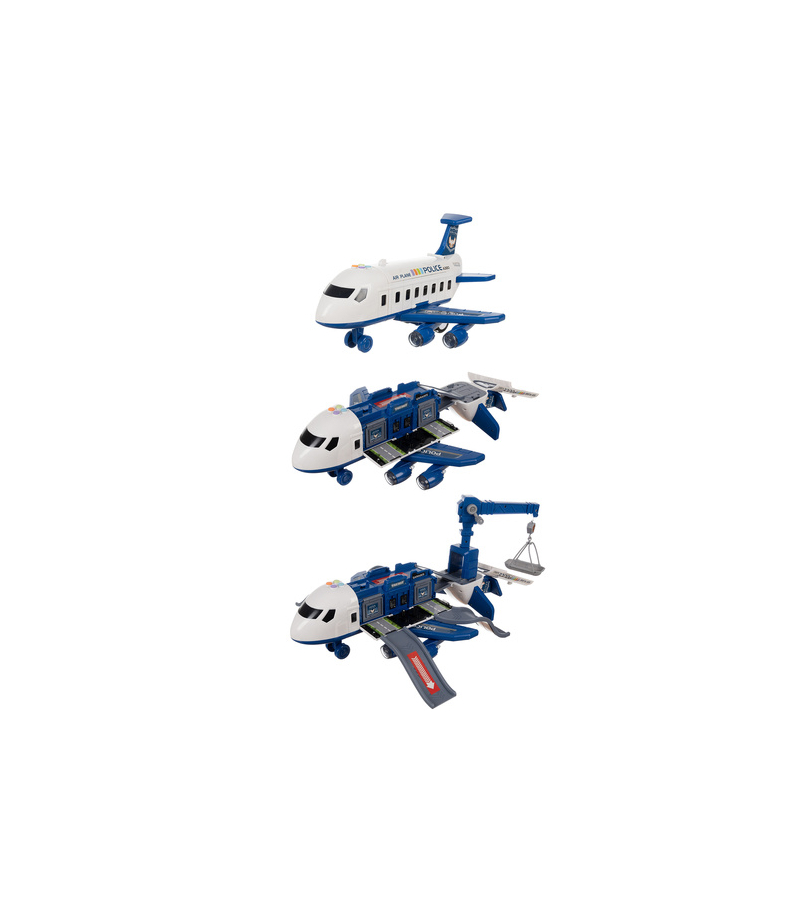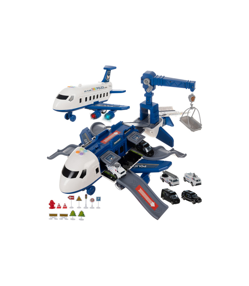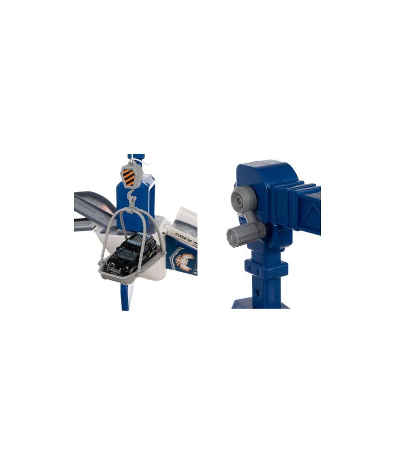 samolot policyjny z ruchomymi elementami – zestaw zawiera duży samolot z otwieranymi burtami, rampą, wyrzutnią aut oraz obrotowym dźwigiem , które dodają zabawie realizmu i urozmaicają każdy scenariusz akcji