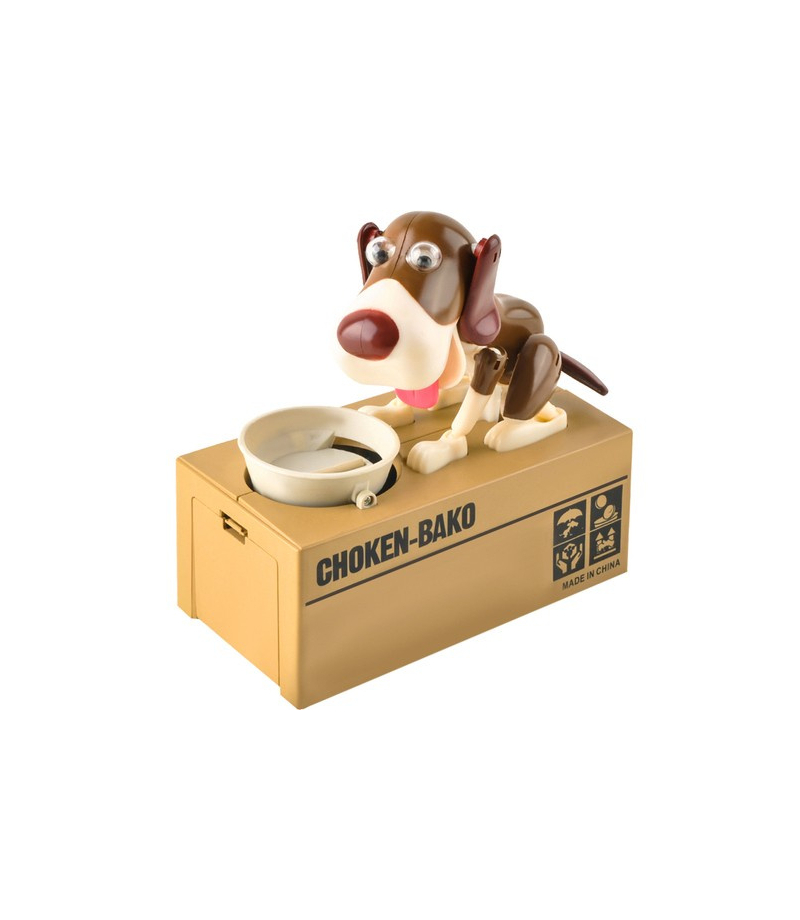 ZASADA DZIAŁANIA - wystarczy włożyć monetę do miseczki znajdującej się przed pieskiem i nacisnąć na miseczkę, a piesek zacznie reagować w taki sposób jakby jadł pokarm z miski powodując wsunięcie się monety do skarbonki.