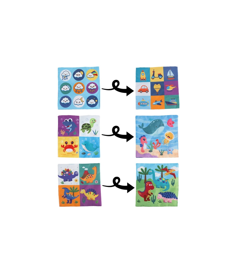 bogate wzornictwo - dzięki kolorowym ilustracjom zwierzątek, różnorodnym wzorom i tematycznym motywom, dziecko uczy się rozpoznawania zwierząt, kolorów oraz środowisk, w których żyją, nauka staje się naturalną częścią zabawy