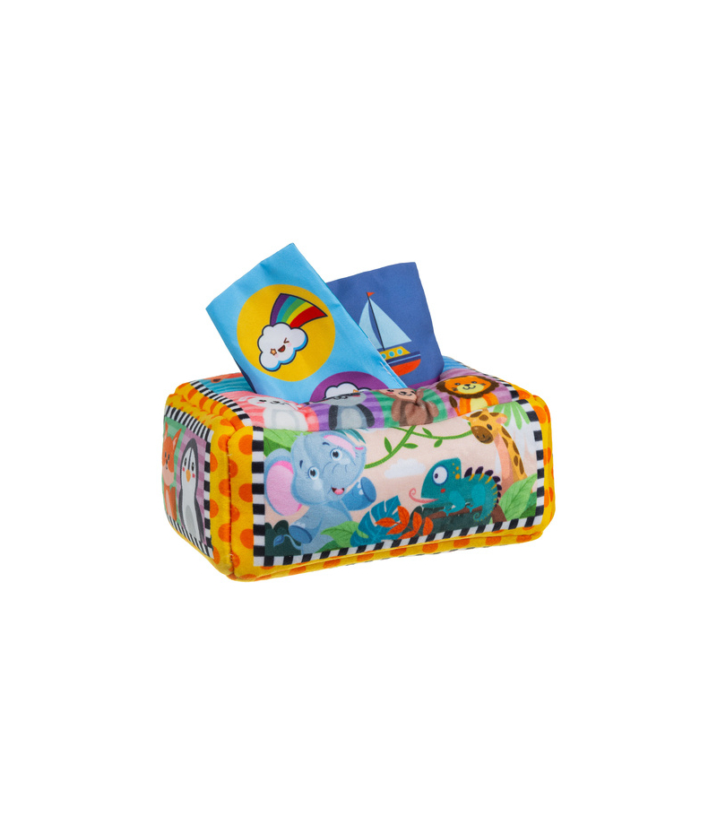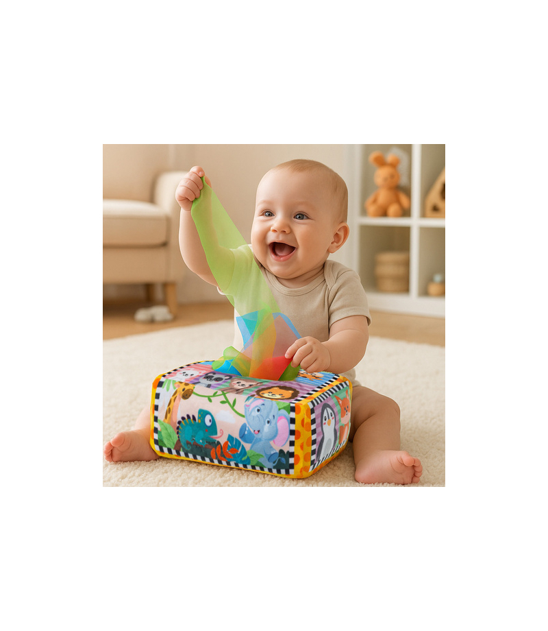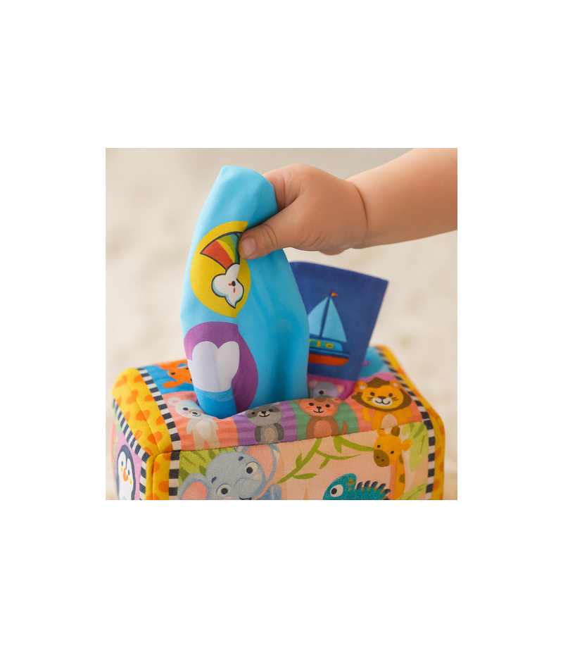 wspiera codzienny rozwój dziecka - sorter w formie materiałowego pudełka z chusteczkami to praktyczna i edukacyjna zabawka , która pomaga najmłodszym rozwijać zdolności manualne, koordynację ręka–oko , a także uczy rozpoznawania kolorów, faktur i sekwencji