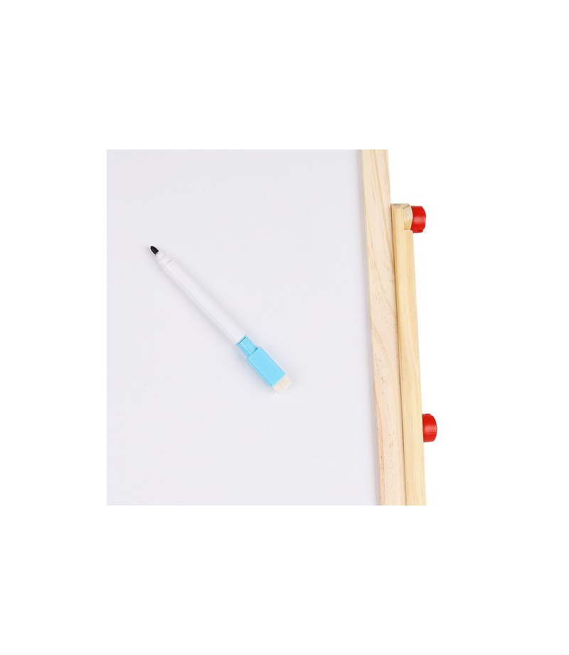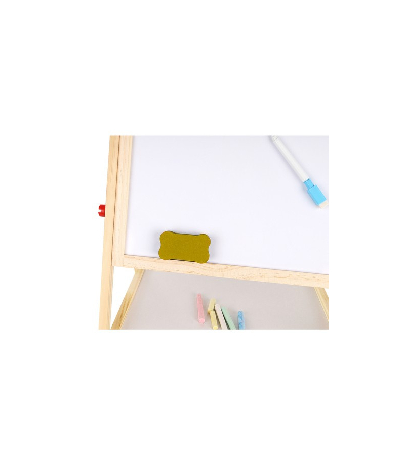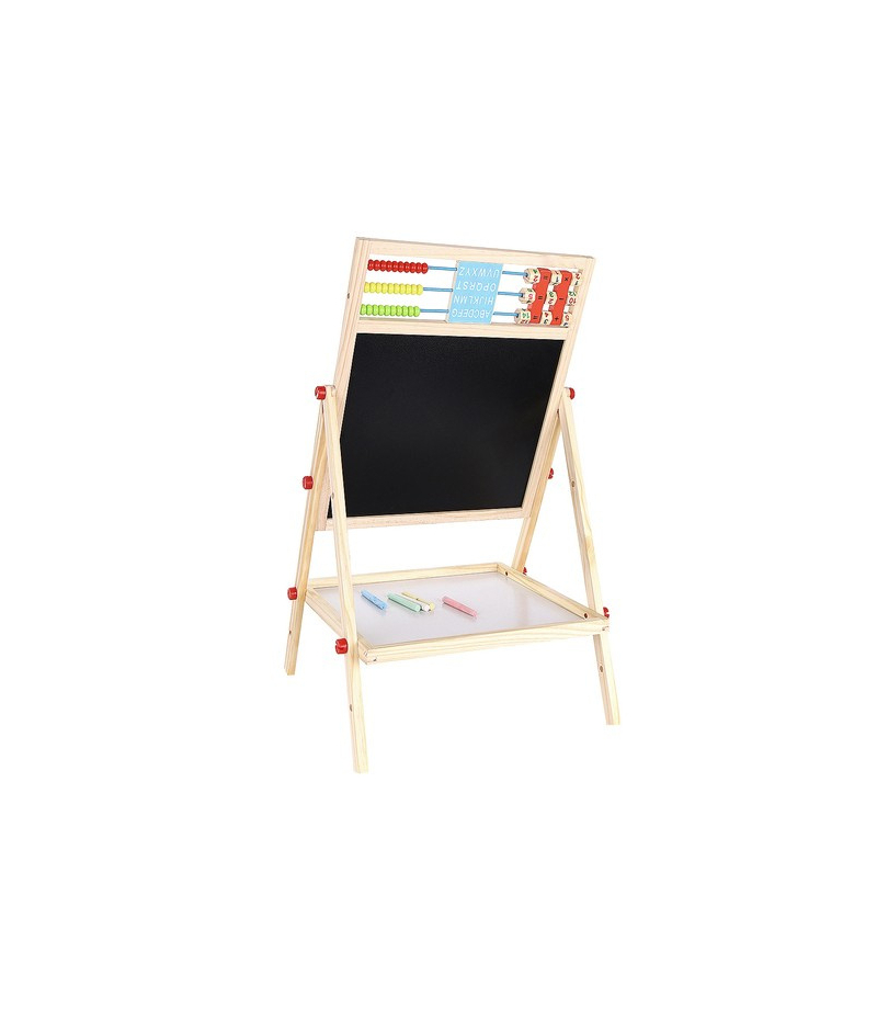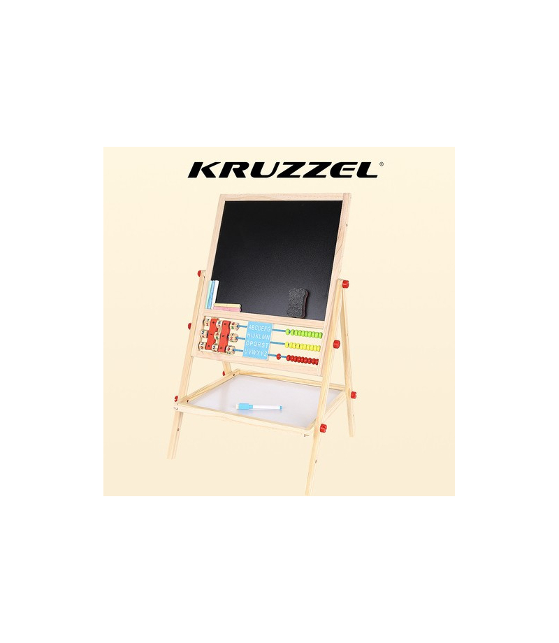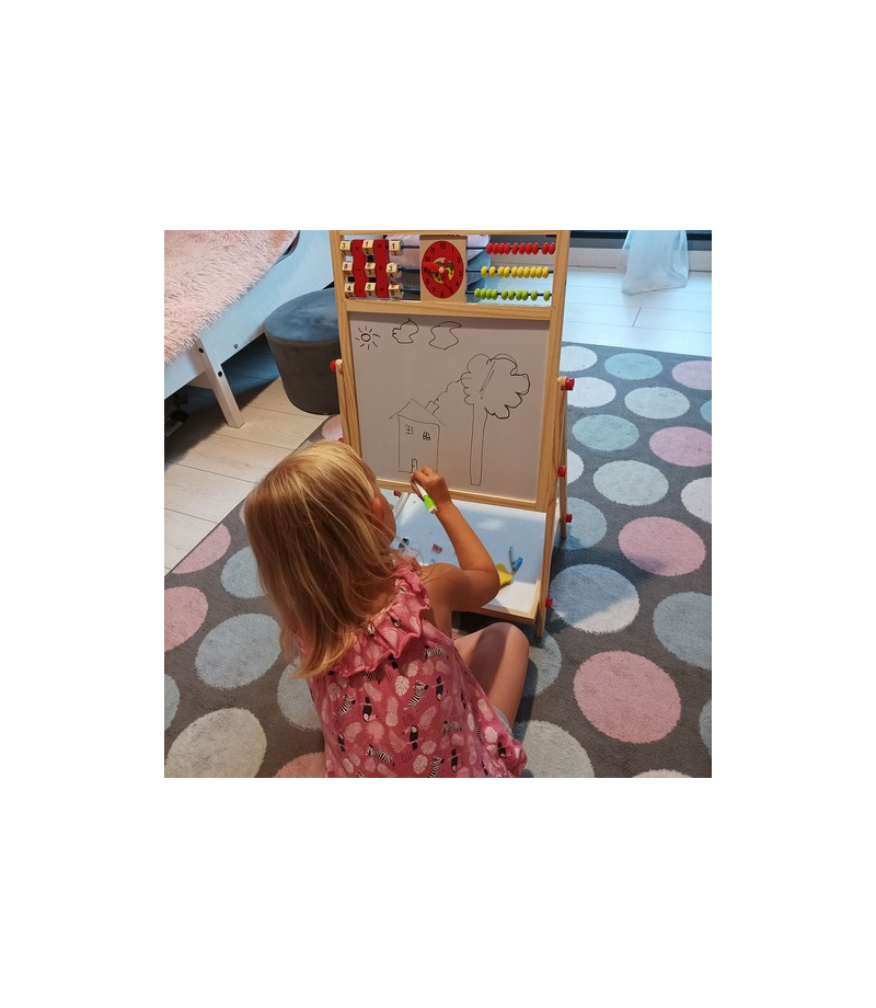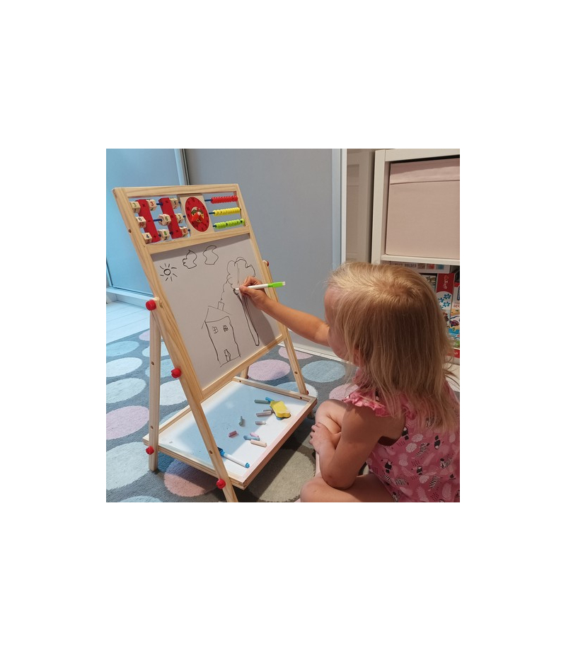 1 TABLICA = 6 FUNKCJI – tablica dwustronna to aż 6 różnych zastosowań. Umożliwia dziecku malowanie kredą po czarnej stronie tablicy oraz malowanie mazakiem po białej stronie. Tablica posiada także klasyczne liczydło z koralikami, z którym dziecko zacznie przygodę z liczeniem. Następnie może uczyć się podstawowych działań matematycznych, takich jak dodawanie, odejmowanie oraz mnożenie. Dziecko będzie miało również do czynienia z zegarem, na którym będzie mogło dowolnie ustawić czas za pomocą wskazówek; nauczy się rozpoznawania godziny. Na tablicy znajduje się również alfabet, który pozwoli dziecku zapoznać się z pierwszymi literami, co pozwoli później na tworzenie pierwszych wyrazów.