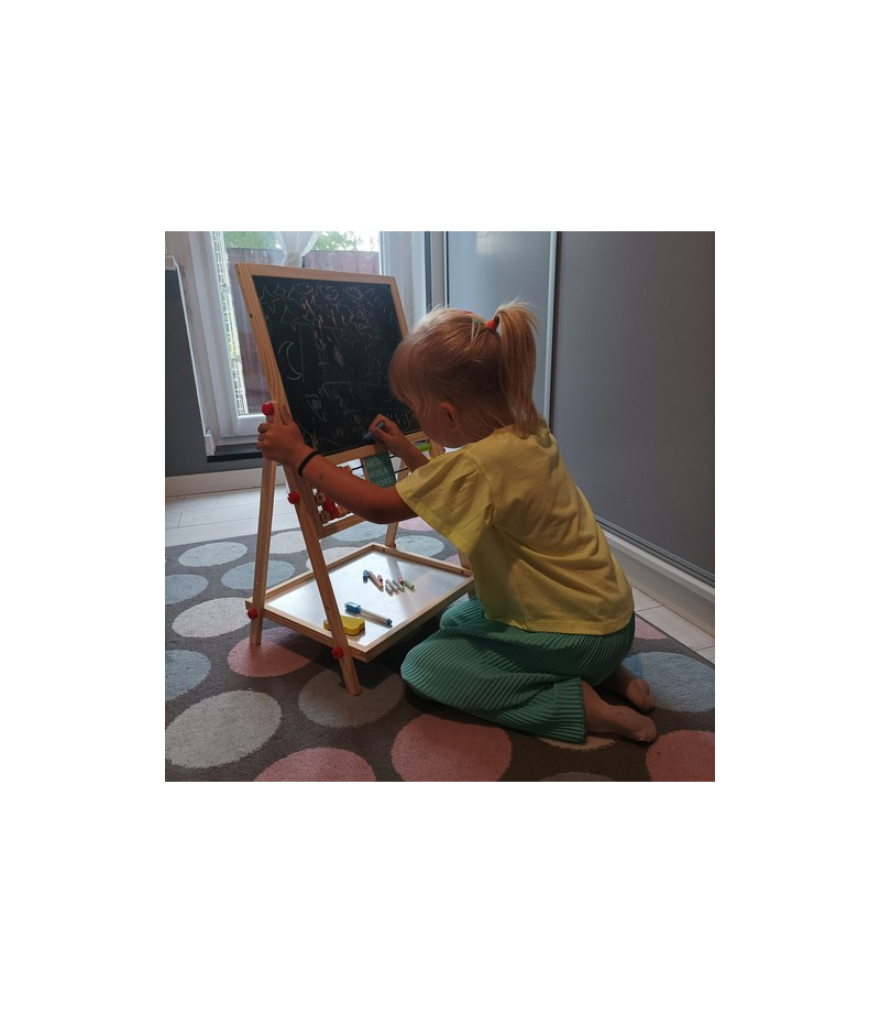 DREWNIANA - rama wielofunkcyjnej tablicy edukacyjnej wykonana jest w całości z drewna – wszystko jest doskonale wyszlifowane i bezpieczne dla najmłodszych. Tablica jest obrotowa i można używać jej na 2 sposoby. Może być skierowana do nas czarną, bądź białą stroną. W zestawie znajdują się duże śruby, które pozwolą na wygodny obrót i zmianę pozycji.