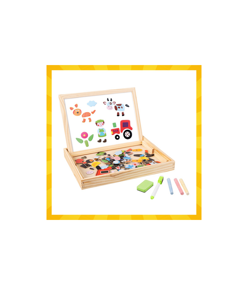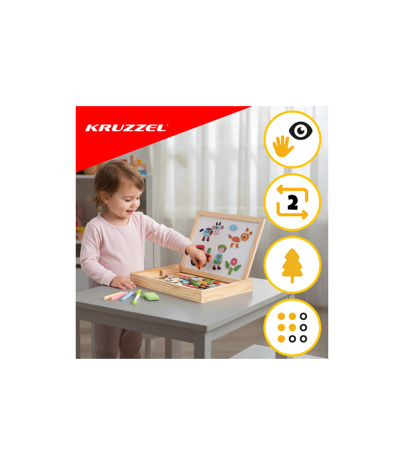 Dwustronna tablica edukacyjna Kruzzel to kreatywna zabawka dla dzieci od 3 lat, która wspiera naukę poprzez zabawę. Pozwala rysować, układać magnesy i tworzyć własne obrazki, rozwijając motorykę, logiczne myślenie i wyobraźnię . Drewniana konstrukcja i aż 108 kolorowych elementów zapewniają trwałość oraz mnóstwo możliwości twórczych.