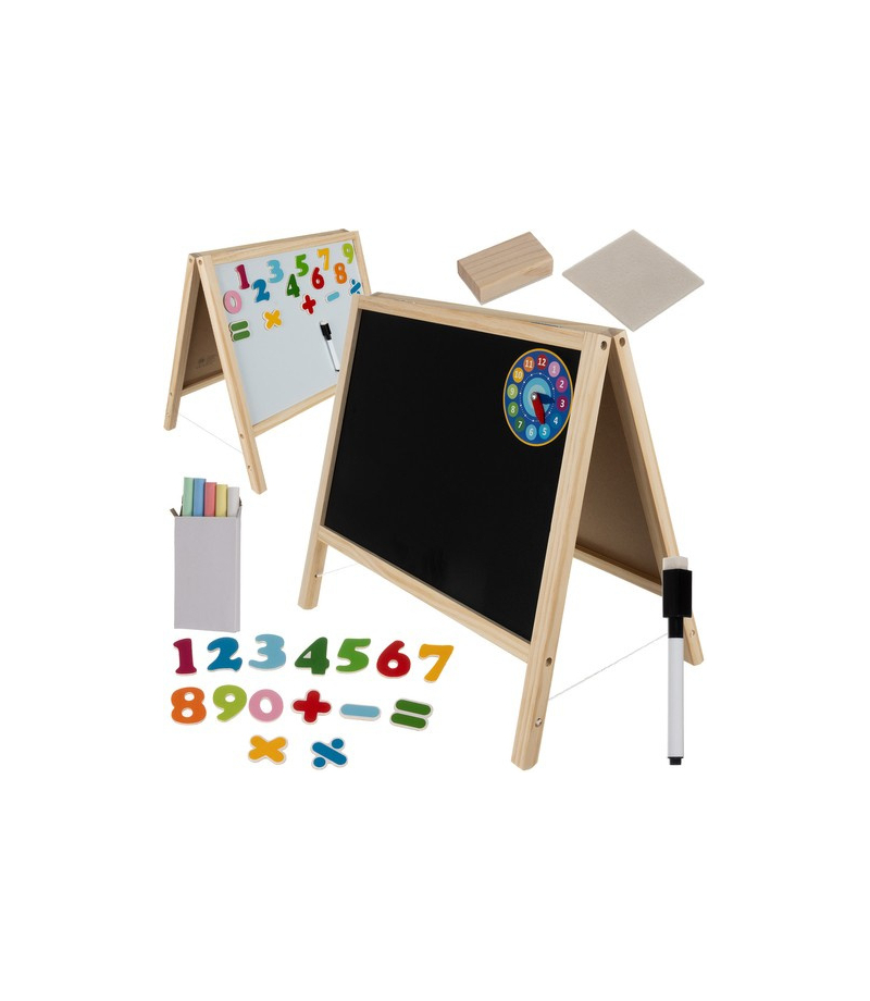Dwustronna tablica magnetyczna kredowa i suchościeralna dla dzieci 4w1! * b ezpieczna dla Twojego dziecka - tablica 2w1 została zaprojektowana z myślą o bezpieczeństwie najmłodszych, każdy element jest zaokrąglony i wykonany z naturalnych, nietoksycznych materiałów, które są bezpieczne dla małych rączek * trwałość - tablica magnetyczna i wszystkie drewniane elementy są wyjątkowo trwałe i odporne na intensywną zabawę, dzięki solidnej konstrukcji przetrwają wiele godzin kreatywnej...