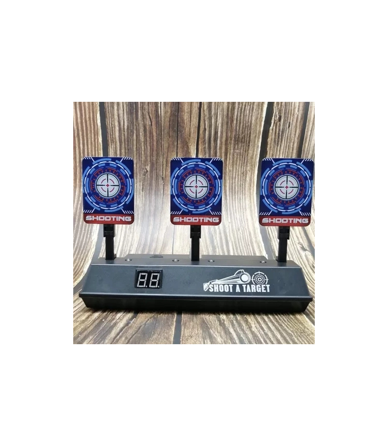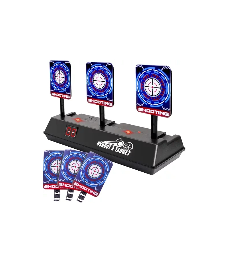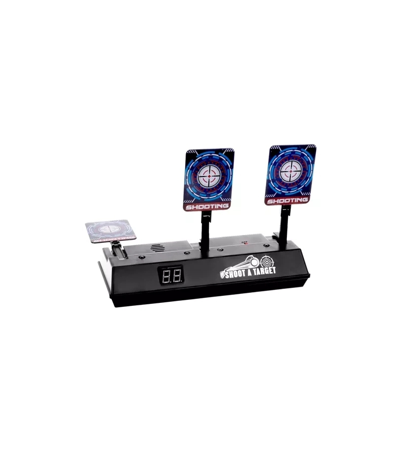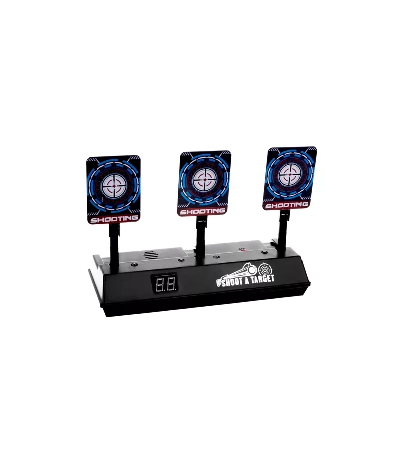 TARCZA ELEKTRONICZNA - STRZELNICA - 3 CELE TARCZA 3 CEL E - ta wyjątkowa tarcza pozwoli poczuć się Twojemu dziecku jak prawdziwy strzelec. Urządzenie wyposażone zostało w wyświetlacz LCD, który wyświetla zdobyte punkty. Po ustrzeleniu wszystkich celi – automatycznie podnoszą się do góry. Dziecko może rywalizować z rówieśnikami lub najbliższymi o miano najlepszego strzelca. EFEKTY DŹWIĘKOWE - po trafieniu w jeden z trzech celi, urządzenie wydaje z siebie odgłosy zbitego szkła...