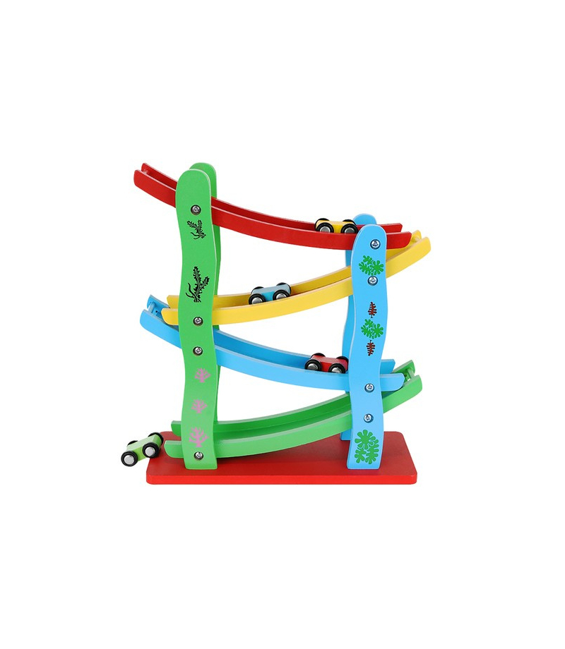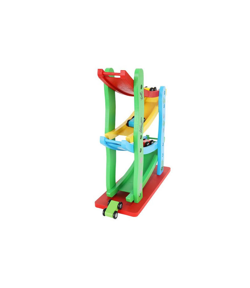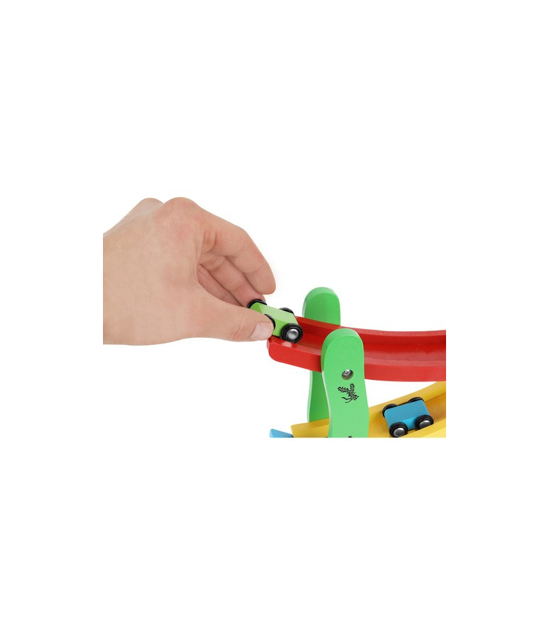 Zjeżdżalnia z autkami posiada 4 poziomy, a tym samym 4 tory wyścigowe, każdy w innym kolorze. Ustawiając samochodzik na najwyższym torze, dziecko może obserwować jak zjeżdża na sam dół. Zabawka została skonstruowana w taki sposób aby pociecha mogła wypuścić 4 pojazdy na raz, jeden po drugim. Podczas zabawy będzie podziwiać prędkość i akrobacje zjeżdżających wozów.