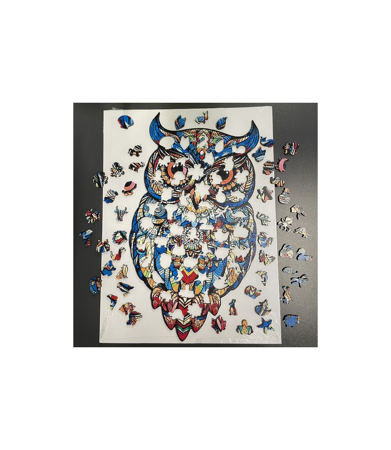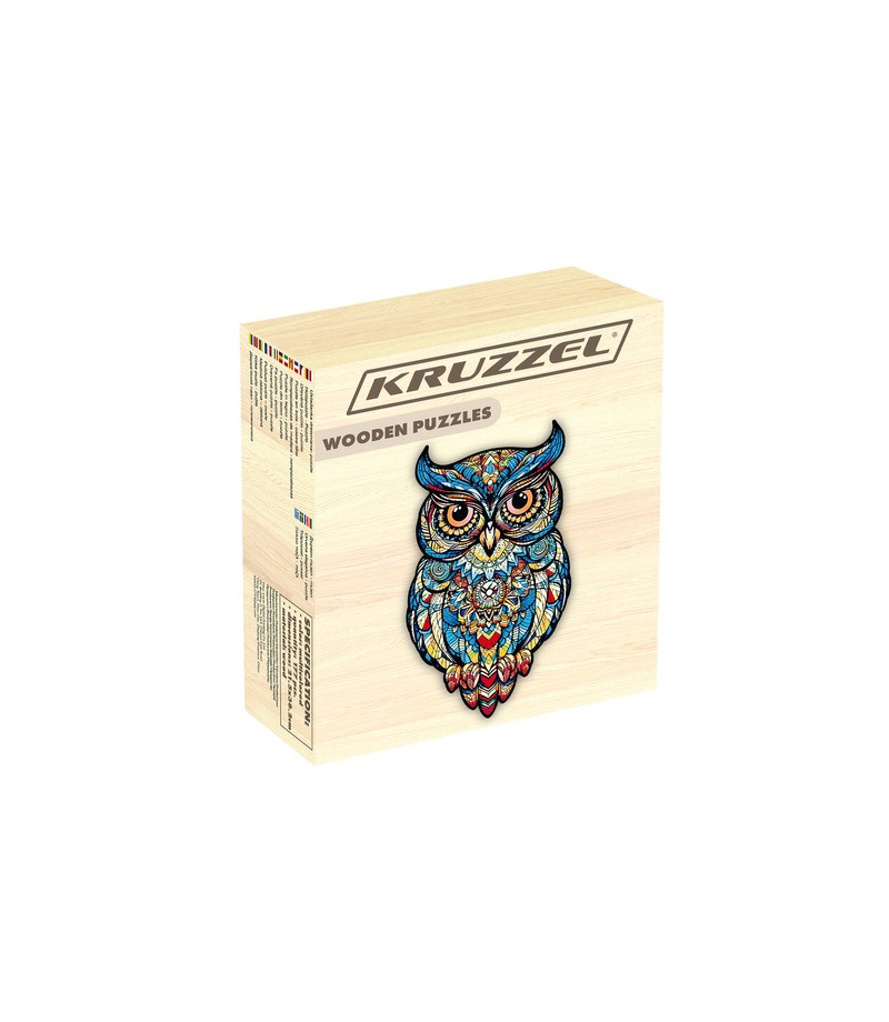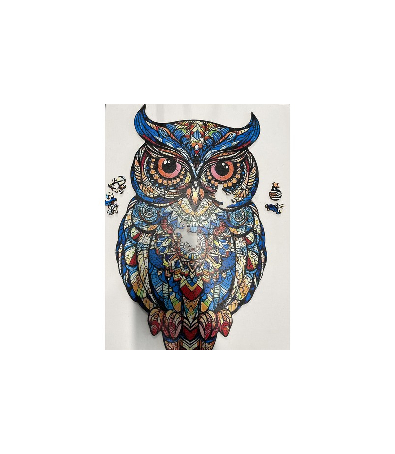 Po ułożeniu puzzli powstaje piękna, kolorowa sowa, składająca się z różnorodnych wzorów i barwnych motywów graficznych. Układanka ma nieregularny kształt, który odwzorowuje sylwetkę ptaka, co dodaje jej unikalności. Podczas składania warto korzystać z grafiki na pudełku jako wskazówki.