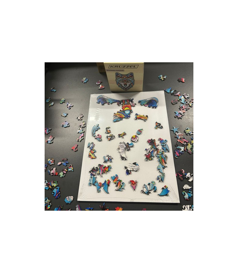 Po ułożeniu puzzli powstaje kolorowy wilk, składający się z różnorodnych wzorów i barwnych motywów graficznych. Układanka ma nieregularny kształt, który odwzorowuje głowę wilka, co dodaje jej unikalności. Podczas składania warto korzystać z grafiki na pudełku jako wskazówki.