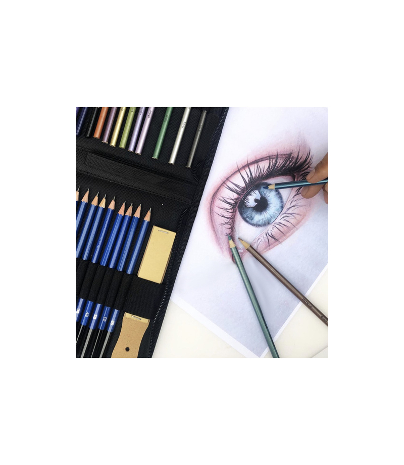 ZESTAW DO SZKICOWANIA, MALOWANIA I RYSOWANIA W ETUI W ZESTAWIE ETUI – cały zestaw jest zamykany w eleganckim materiałowym etui. Jego czarny kolor sprawdzi się zarówno dla kobiety, mężczyzny, dziewczynki i chłopca. Dzięki gumkom zabezpieczającym, każdy produkt ma swoje miejsce, więc ich przechowywanie i przenoszenie jest łatwe . Dodatkowo jest wyposażony w jeden składany wkład na akcesoria takie jak kredki, ołówki, węgiel itp. Całość jest zapinana na zamek oraz posiada zawieszkę....