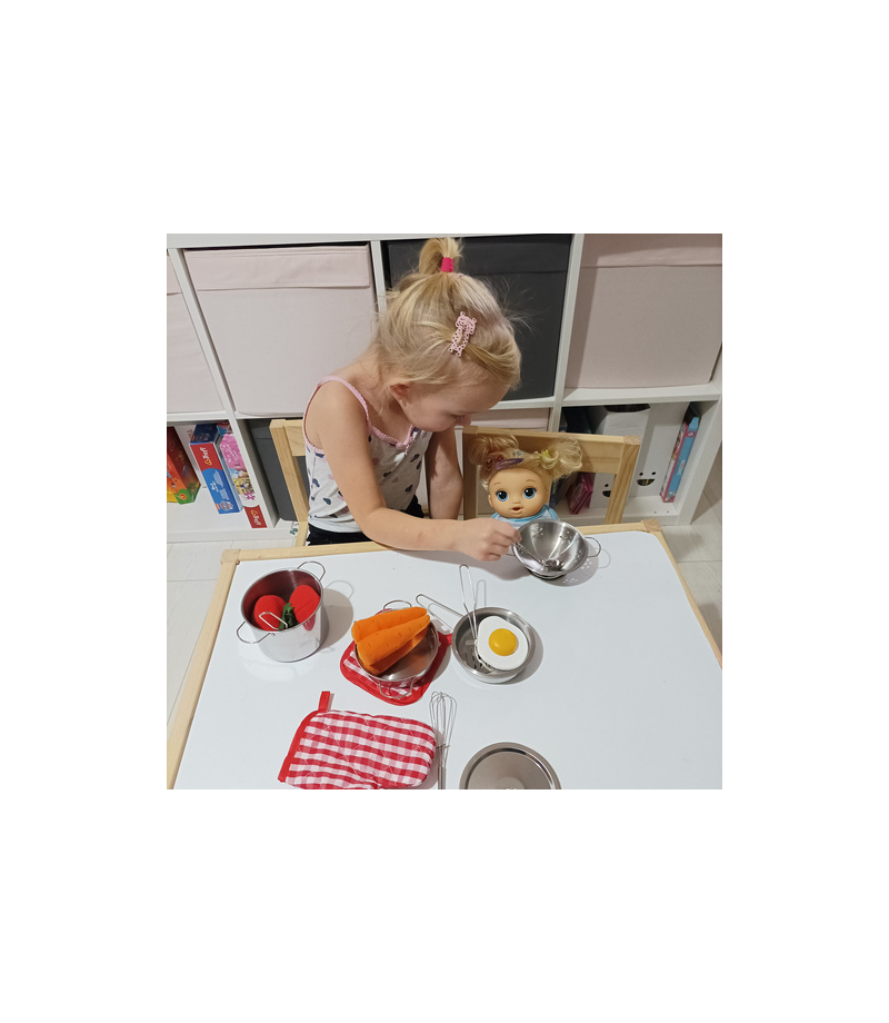 Produkt jest idealnie odwzorowany, dlatego imituje prawdziwe garnki, a jak wiadomo dzieci naśladują swoich rodziców, więc pozwala im to na wspólną zabawę z rodzicami. Dziecko może przyrządzić obiad dla swoich lalek czy misiów. Zestaw srebrnych garnków umożliwia interesującą zabawę w dom, bar, restaurację. Srebrny, klasyczny kolor będzie pasował do każdej kuchni, a maluch poczuje się jak prawdziwy szef kuchni. Zabawka nie tylko umożliwia ciekawe i radosne spędzenie czasu, ale również wpływa na rozwój intelektualny dziecka oraz wzrost jego umiejętności motorycznych (ruchowych). Rozwija wyobraźnię i pobudza kreatywność, a także uczy współpracy w grupie i usprawnia zdolności społeczno-integracyjne. Zestaw znakomicie nadaje się do samodzielnej zabawy oraz z dorosłymi lub z innymi dziećmi.