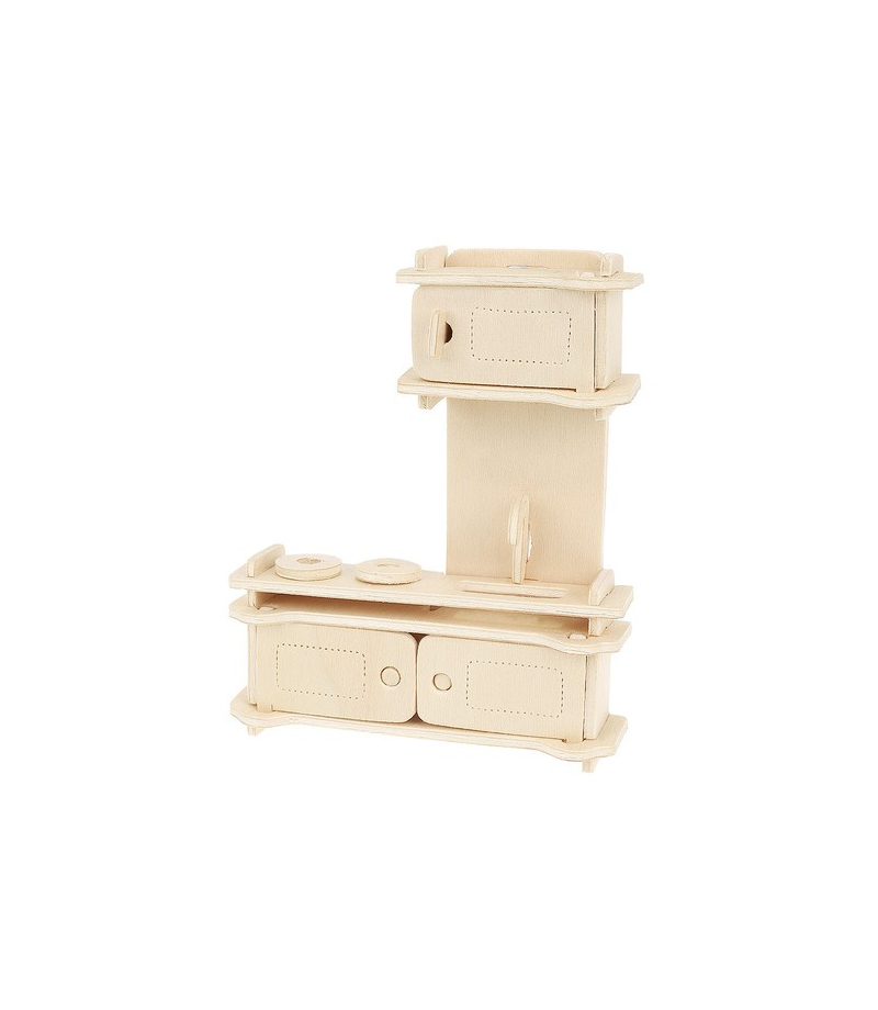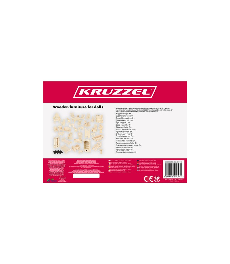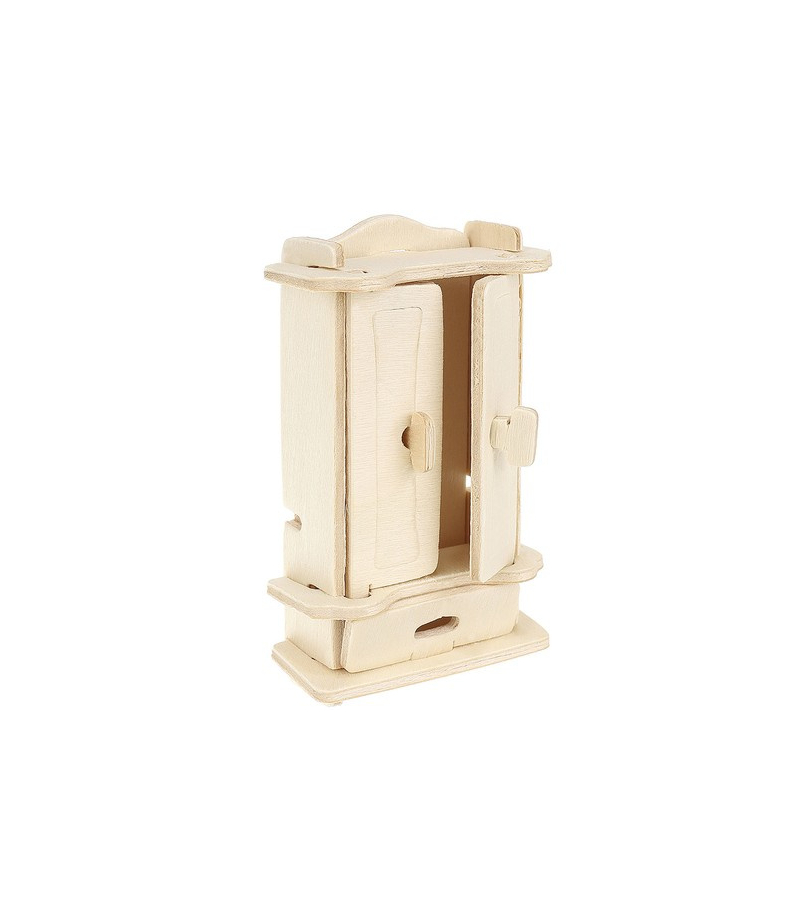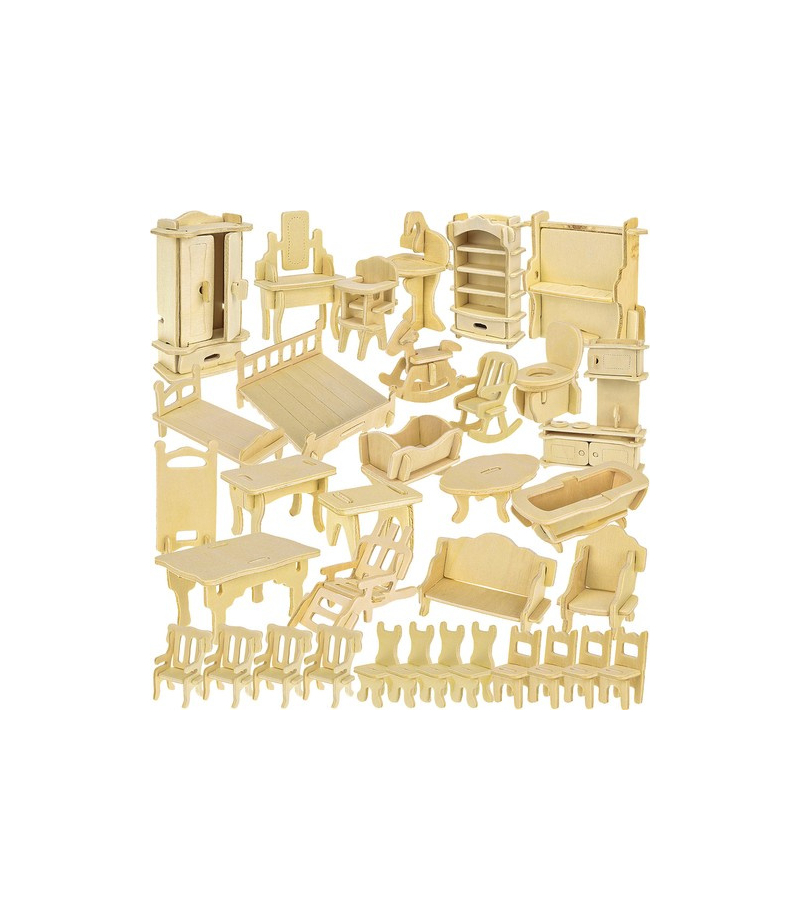 Zestaw 34 mebelkówW komplecie znajdują się 34 meble do samodzielnego złożenia. Część mebli zawiera ruchome elementy, np. otwierane drzwi w szafie. Mebelki będą kompletnym wyposażeniem każdego domku dla lalek. Komplet to: