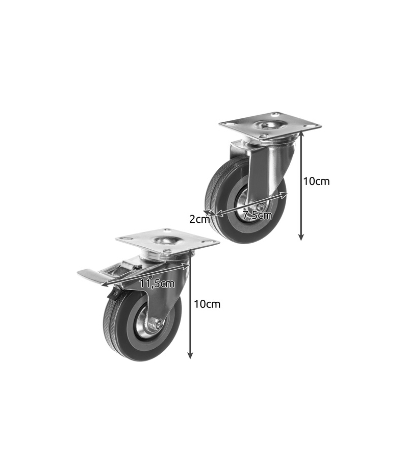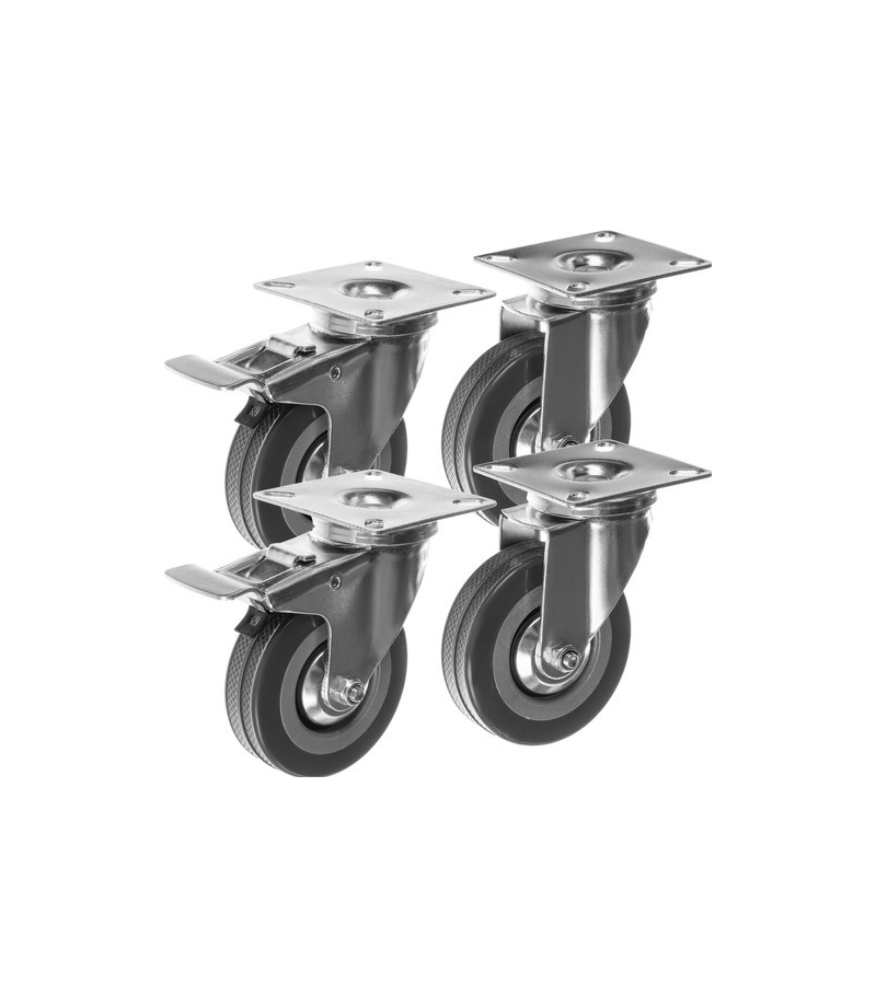 Kółka przemysłowe to elementy, które są używane w różnych branżach przemysłowych do ułatwienia przemieszczania się ciężkich ładunków, maszyn lub urządzeń. Koła są wysokiej jakości, posiadają gumowy bieżnik i kulkowe łożysko górnej płytki. Kółka są obrotowe 360 stopni, z podwójnym hamulcem: hamulec blokuje obrót kół wraz ze skręcaniem. Mocowanie nie powinno przysparzać problemów. Przykręcasz bezpośrednio w stalową, ocynkowana blachę w nadkolu.