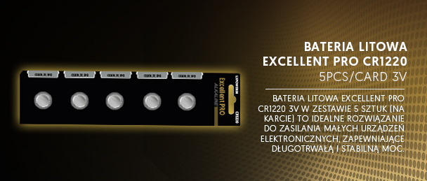 BATERIA LITOWA EXCELLENT PRO CR1220 5szt. 3V LAMEX LXPOWER08 Bateria litowa EXCELLENT PRO CR1220 3V - 5 sztuk/karta Niezawodne baterie litowe CR1220 od EXCELLENT PROZasil swoje urządzenia wysokiej jakości źródłem energii! Zestaw 5 baterii litowych EXCELLENT PRO CR1220 3V to doskonałe rozwiązanie do zasilania małych urządzeń elektronicznych, takich jak piloty, kluczyki samochodowe, urządzenia medyczne, czujniki czy kalkulatory. Ekonomiczne opakowanie, wysoka...