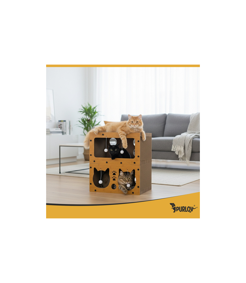 Drapak dla kota Purlov - piętrowy domek 2 piętrowy- eko tektura falista i HDF - 51,5x45,x28 cm - legowisko z zabawkami - stabilny i antypoślizgowy Drapak z domkiem 3w1 Purlov to połączenie elegancji, trwałości i kociej frajdy. Dwupoziomowa konstrukcja z płyt HDF zapewnia stabilność i bezpieczeństwo, a 4 piłeczki gwarantują codzienną porcję ruchu i zabawy. Naturalna, twarda powierzchnia zachęca do drapania - więc Twoje meble...