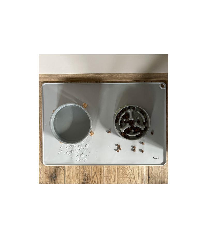 podwyższone ranty - skutecznie zatrzymują rozlaną wodę i resztki jedzenia, chroniąc podłogę przed zabrudzeniami i ułatwiając utrzymanie czystości wokół misek