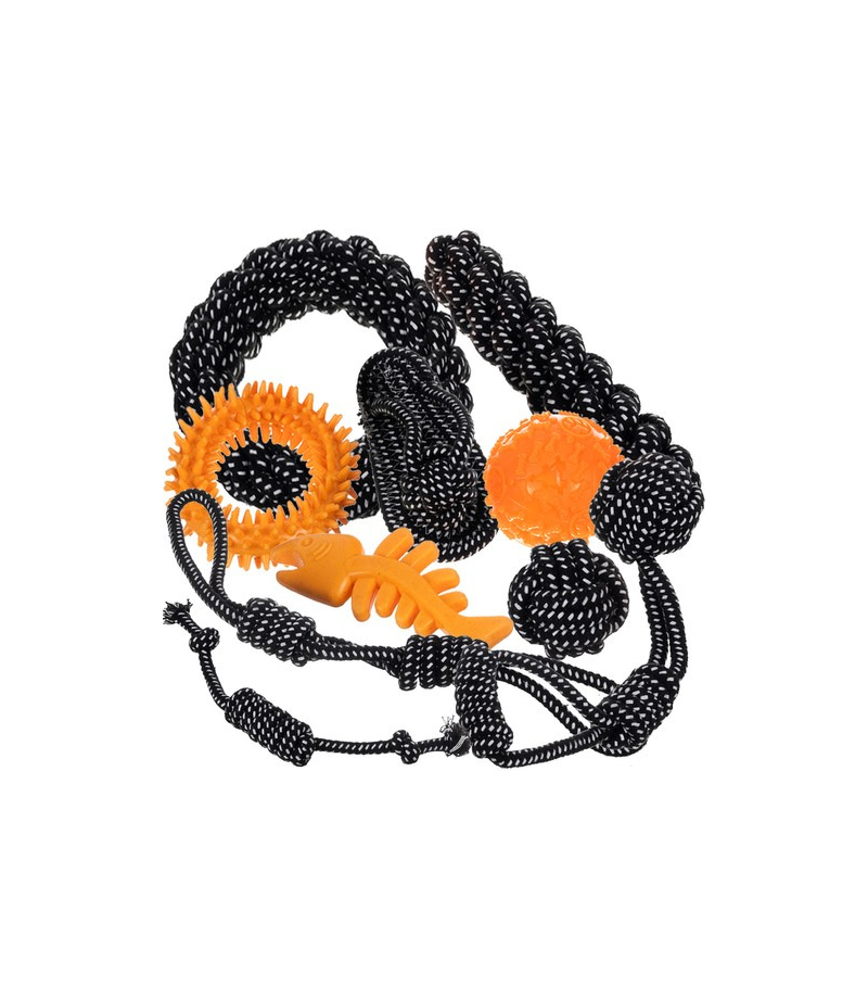 DUŻY ZESTAW ZABAWEK DLA PSA RÓŻNORODNOŚĆ ZABAWEK - zestaw 10 zabawek dla psa to idealne rozwiązanie, które dostarcza czworonogom różnorodnych form rozrywki i aktywności . W skład zestawu wchodzą trzy różne szarpaki – z dwoma pętlami, z kulką oraz zakończony supłami . Zabawki te są wykonane z wytrzymałej liny w kolorze czarno-białym , co nie tylko przyciąga uwagę psa, ale także sprawia, że są trwałe i odporne na uszkodzenia . Dodatkowo, zestaw zawiera pleciony gryzak w kształcie...