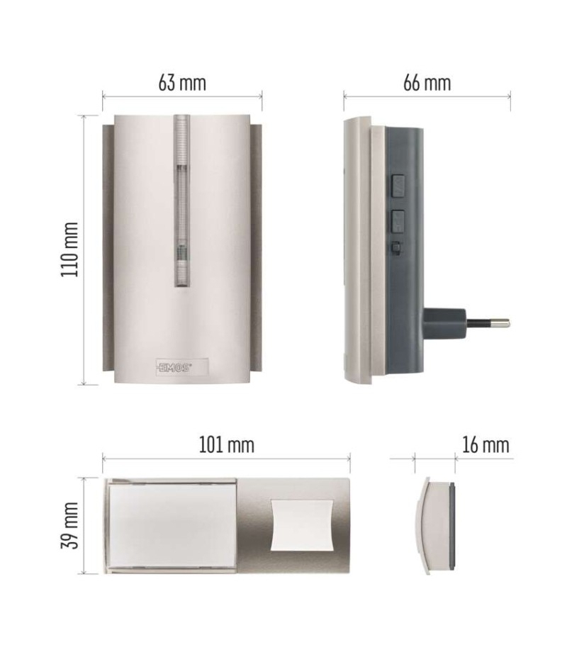 Dzwonek bezprzewodowy do drzwi P5760N, możliwość przedłużenia zasięgu przycisku EMOS P5760N Częstotliwość: 433 MHz Dodatkowy przycisk (wymienny): P5760T Funkcje specjalne: wyjście USB–C – PD 20W, funkcja repeatera – umożliwia przedłużenie zasięgu przycisku o dodatkowe kilkaset metrów Ilość melodii: 16 Ilość odbiorników w komplecie: 1...