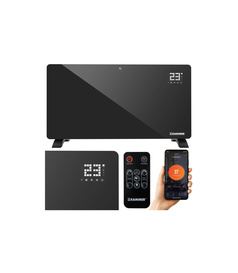 Grzejnik elektryczny szklany KAMINER ZELVA mocny 2300 - 2500W sterowanie aplikacją WiFi Tuya, Smart Life i pilotem. - sterowanie przez WiFi – obsługuj grzejnik z aplikacji Smart Life na telefonie lub tablecie, włącz, wyłącz, ustaw temperaturę czy timer z dowolnego miejsca – pełna kontrola nawet poza domem - innowacyjna konstrukcja X-SHAPE - dzięki niej grzejnik KAMINER nagrzewa się szybciej, równomiernie rozprowadza ciepło i pracuje jeszcze wydajniej - pilot w...