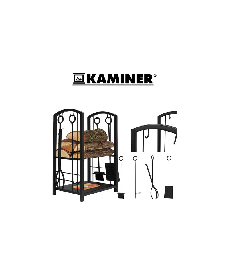 W komplecie znajdują się wszystkie elementy niezbędne do obsługi kominków i innego rodzaju palenisk; szczypce, szufelka, miotełka oraz pogrzebacz, dzięki czemu zestaw ma szerokie zastosowanie i spełni oczekiwania każdego. Pogrzebacz służy do równomiernego rozkładania palącego się drewna bądź węgla lub brykietu, a także do oczyszczania rusztu w celu lepszego przepływu powietrza. Tą samą funkcje mogą pełnić szczypce, które dodatkowo wykorzystuje się do przenoszenia palących się szczap drewna lub węgla. Jest to szczególnie istotne, kiedy wypadną z paleniska i trzeba je niezwłocznie usunąć z podłoża. Kolejne elementy to szufelka oraz miotełka, które są niezbędne do dokładnego oczyszczenia płyty paleniskowej. Pomagają usunąć nie tylko popiół, ale ewentualnie niedopalone resztki. Akcesoria posiadają specjalne uchwyty za które powiesimy je na haczykach znajdujących się na stojaku.
