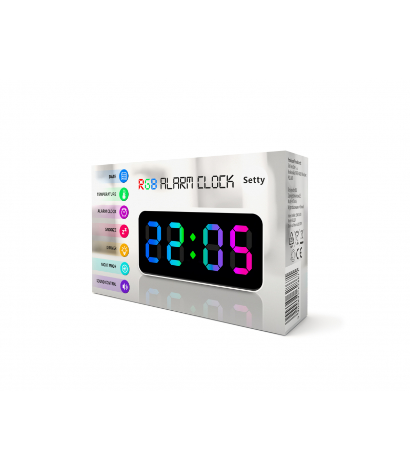 Setty Budzik RGB TFO GSM176708 Format godziny: 12 h/24 h Jednostka temperatury: °C/°F Zakres temperatury: -10~50 (14~122). Sterowanie dźwiękiem : Tak FUNKCJE: data, temperatura otoczenia, budzik, drzemka, tryb nocny, Zasilanie USB: 5V 0.1A Bateria: 3V ( CR2032 ) w zestawie Funkcje: czujnik...
