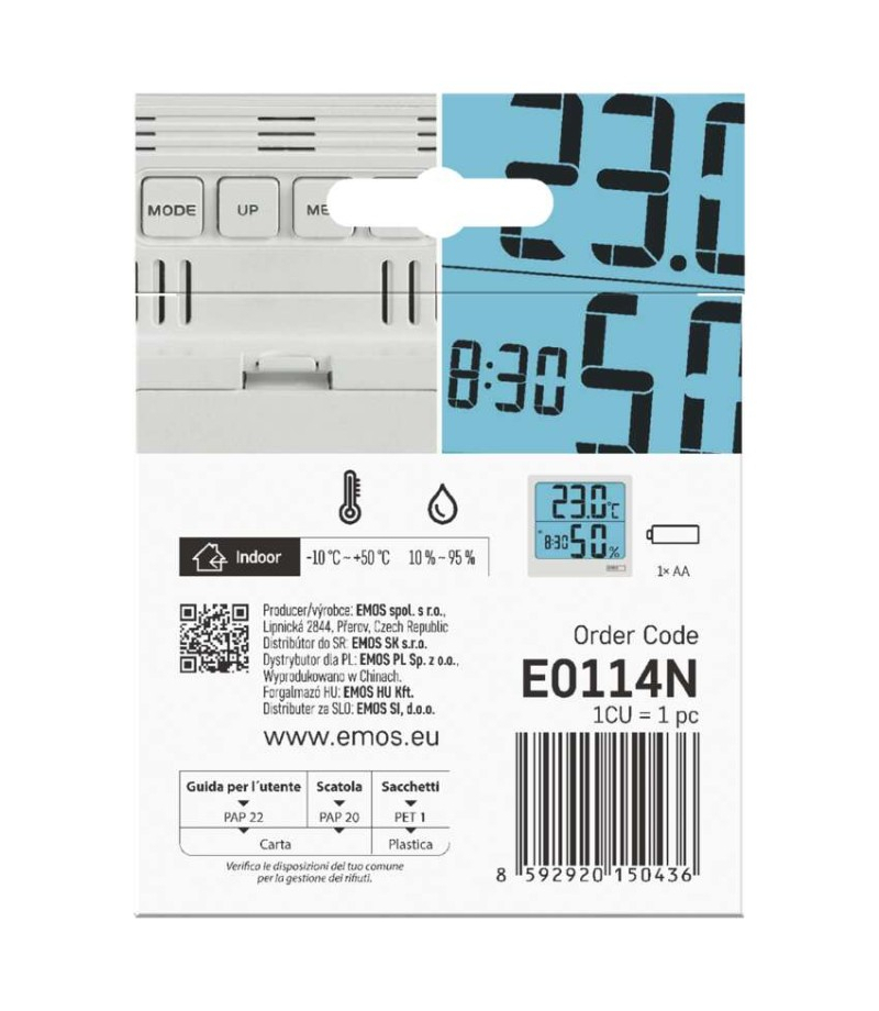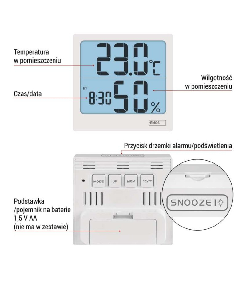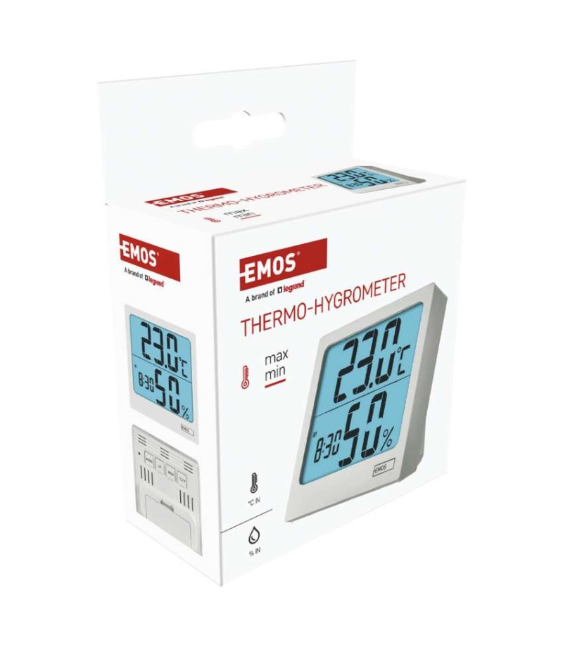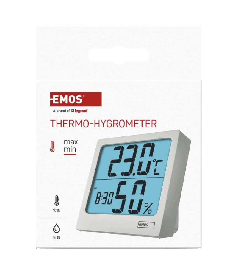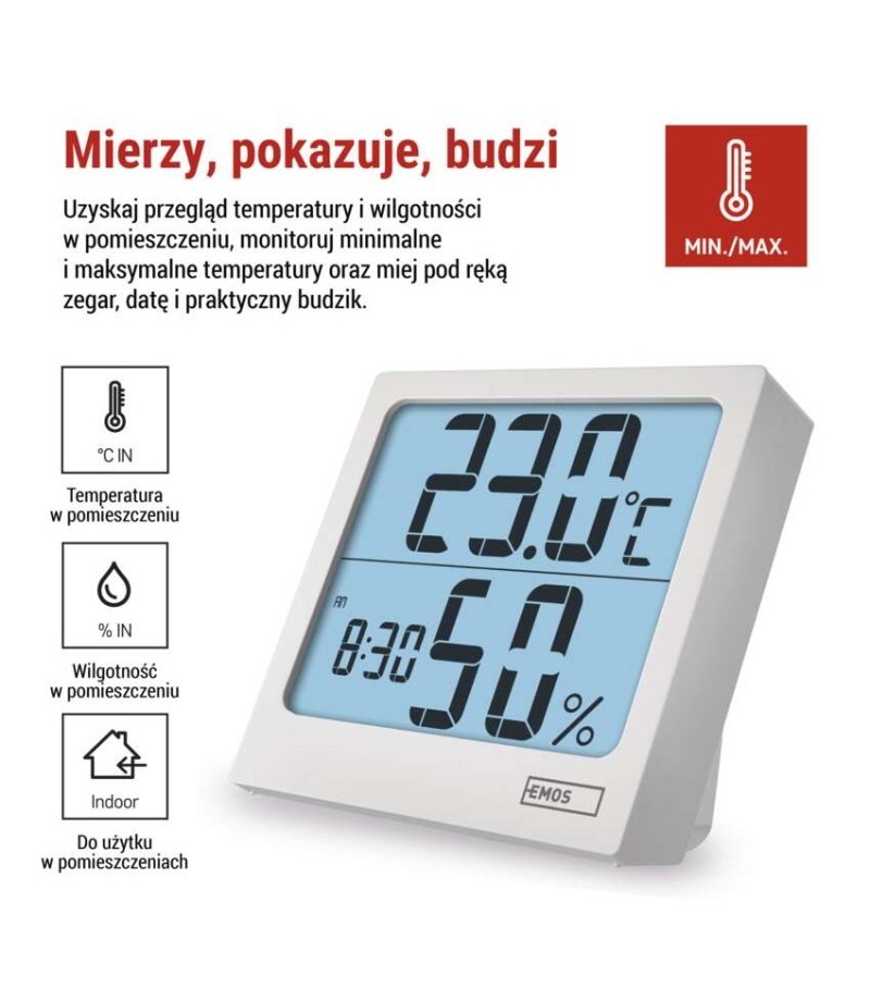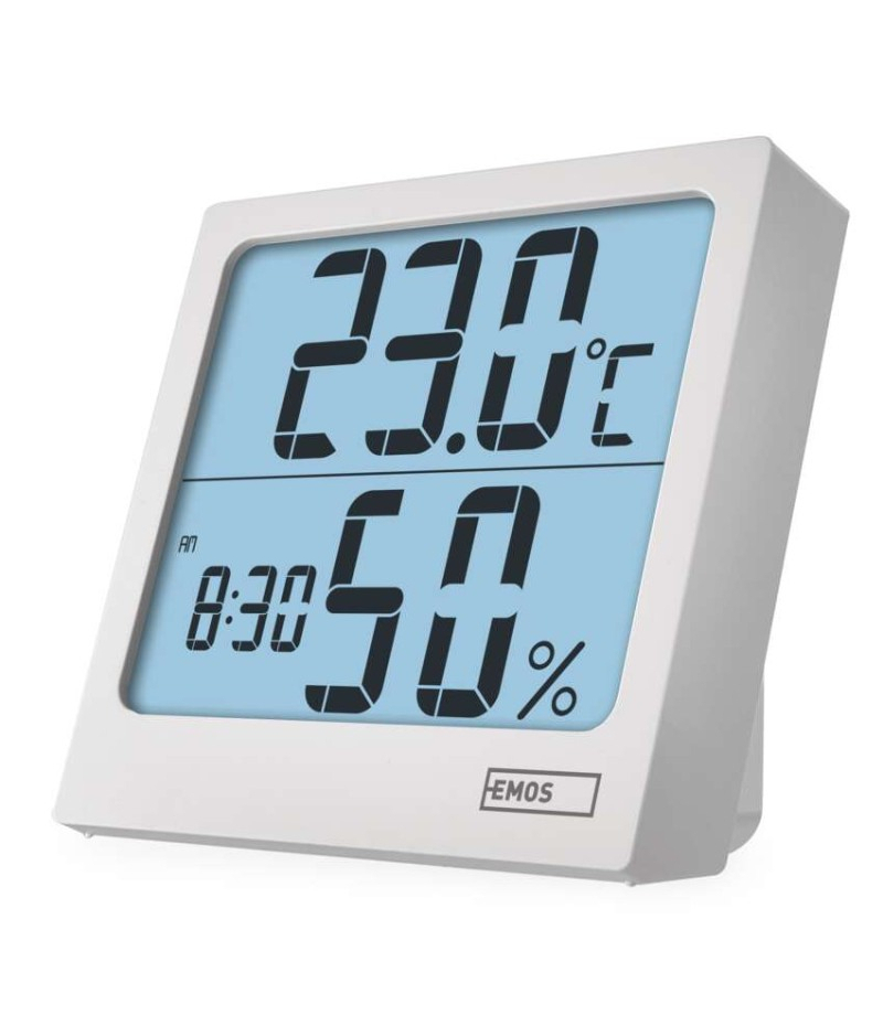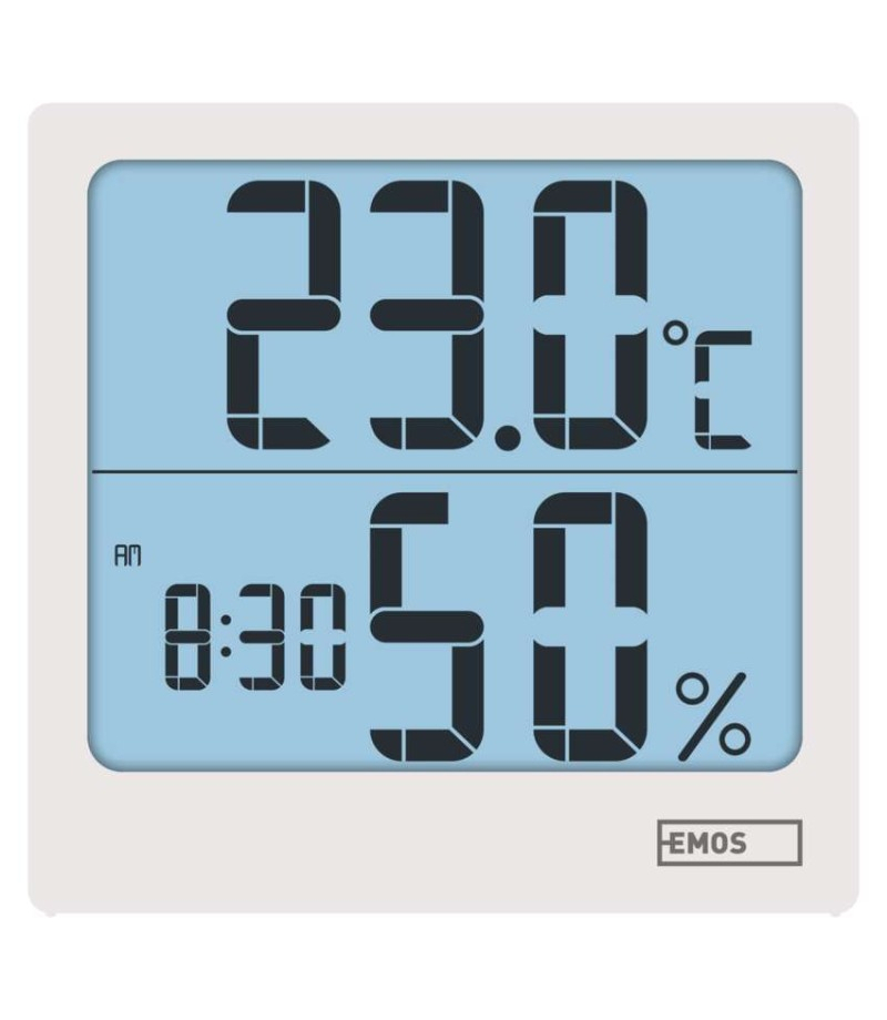Termometr z higrometrem, cyfrowy z dużym podświetlanym wyświetlaczem, zegarem i budzikiem, 88x86mm, E0114N EMOS E0114N 12/24 godzinny format czasu: tak Budzik: tak Ciągłe podświetlenie: nie Częstotliwość: nie Data: tak Dodatkowe czujniki: nie Indeks temperatury: nie...