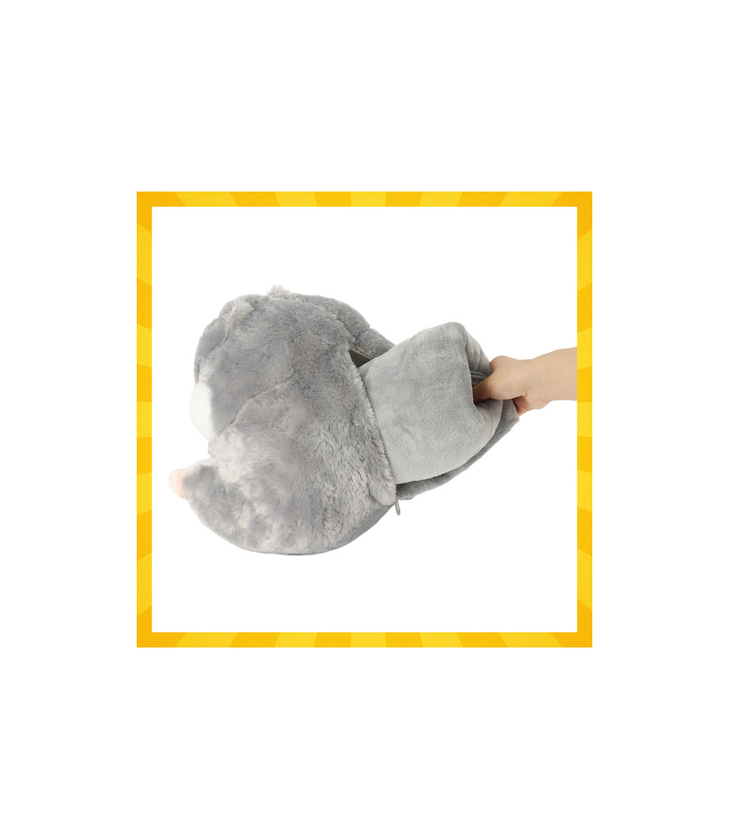 - 3w1 - kocyk, poduszka i maskotka w jednym – praktyczne rozwiązanie, które daje dziecku ciepło, komfort i zabawę jednocześnie; wystarczy zamek błyskawiczny, by w sekundę zmienić przytulankę w koc lub miękką poduszkę.
