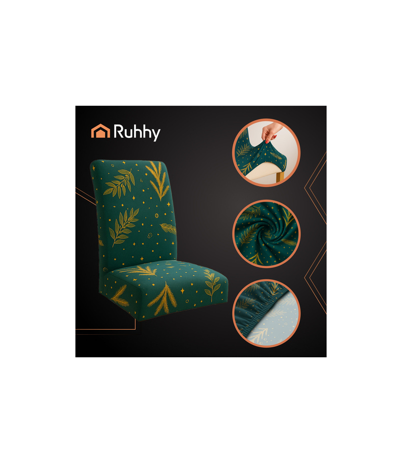 Pokrowce marki RUHHY wykonane z miękkiego, przyjemnego w dotyku materiału idealnie dopasowują się do kształtu krzesła, nadając mu odświętny i stylowy wygląd, a jednocześnie chronią przed zabrudzeniami, zadrapaniami czy codziennym zużyciem. Zielony, świąteczny wzór wprowadza do wnętrza wyjątkowy klimat i pięknie komponuje się z dekoracjami bożonarodzeniowymi . Rozmiar 65x35x40 cm sprawia, że pasują do większości standardowych krzeseł dostępnych na rynku, a zestaw 6 sztuk pozwala szybko i efektownie odmienić cały stół.