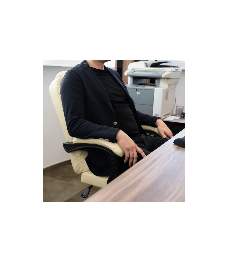 Fotel biurowy idealnie dopasowujący się do sylwetki siedzącego, obity miękką ekoskórą. Jest wyprofilowany tak, aby zapewnić maksymalną wygodę, nawet przy wielogodzinnym siedzeniu. Dodatkowo fotel posiada podwójną warstwę gąbki, która w znaczący sposób podnosi komfort użytkowania. Wysoki, wbudowany zagłówek i odpowiednie wyprofilowanie gwarantuje funkcjonalność i oparcie dla głowy, a szerokie siedzisko pozwoli na wielogodzinną pracę. Podłokietniki są miękkie i wygodne, co zmniejsza ból łokci, a także obciążenie kręgosłupa.