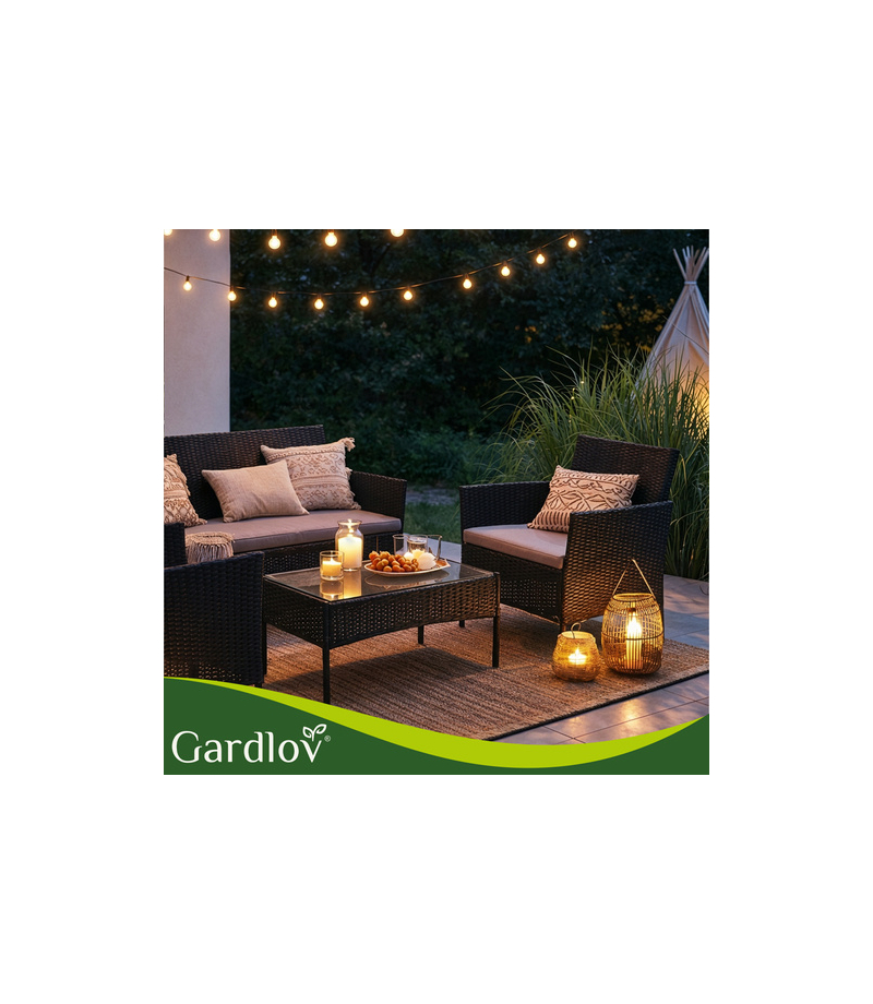 Meble ogrodowe technorattanowe czarne Gardlov - zestaw 2 krzeseł, sofa, stolik ze szkłem i poduszkami Szukasz wygodnego i eleganckiego zestawu mebli do ogrodu, na taras lub balkon Zestaw mebli ogrodowych Gardlov w kolorze czarnym to idealne rozwiązanie, które zapewnia komfortowy wypoczynek i stylowy wygląd Twojej przestrzeni na świeżym powietrzu . Teraz stworzysz wymarzony kącik relaksu dla całej rodziny. Najważniejsze zalety mebli na ogród Gardlov - wytrzymała konstrukcja - stal ocynkowana pokryta technorattanem gwarantuje trwałość i stabilność -komfortowe poduszki - materiał poliester z wypełnieniem bawełnianym zapewnia wygodę i wodoodporność - odporność na warunki atmosferyczne - meble nie blakną pod wpływem promieni słońca i deszczu - łatwe czyszczenie - wystarczy wilgotna ściereczka i delikatny detergent -blat stolika ze szkła - elegancki i praktyczny, idealny do serwowania napojów i przekąsek - stabilność i bezpieczeństwo - szerokie nogi i solidna konstrukcja utrzymują maksymalne obciążenia: fotel 150 kg, sofa 300 kg - nowoczesny design - uniwersalny styl pasuje do tarasów, balkonów i ogrodów -łatwy montaż z instrukcją i filmem QR - szybko i bezproblemowo ustawisz meble w swoim ogrodzie -stabilna... Więcej szczegółów