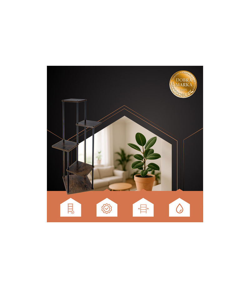 Stylowy, 5-poziomowy kwietnik stojący w stylu loft to idealne rozwiązanie do ekspozycji kwiatów i roślin w domu lub na balkonie. Stabilna metalowa konstrukcja zapewnia trwałość i bezpieczeństwo, a minimalistyczny design pasuje do każdego wnętrza. Dzięki kilku poziomom możesz wyeksponować wiele roślin na małej przestrzeni – funkcjonalnie i z klasą.
