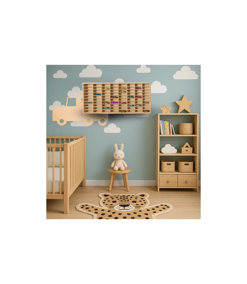 Półka na samochodziki autka resoraki, TIR organizer na 80 miejsc drewniana KRUZZEL! pomieści całą kolekcję resoraków – regał został zaprojektowany z myślą o kolekcjonerach – 80 precyzyjnie wyciętych przegródek gwarantuje porządek i efektowną ekspozycję, każdy model ma swoje miejsce, co sprawia, że półka jest nie tylko praktyczna, ale i dekoracyjna bezpieczny dla dzieci - dzięki starannemu wykończeniu i brakowi ostrych krawędzi , regał jest w pełni bezpieczny nawet dla...