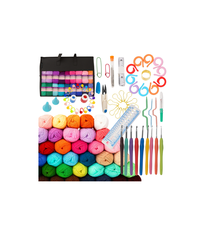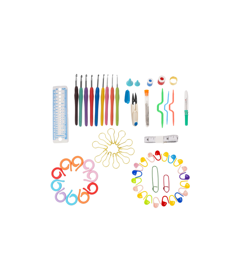 - zawiera wszystko, co potrzebne - oprócz szydełek w różnych rozmiarach znajdziesz także 40 motków włóczki, taśmę, obcinaczki i inne akcesoria – aż 113 elementów! Nie musisz niczego dokupować – możesz od razu zacząć tworzyć