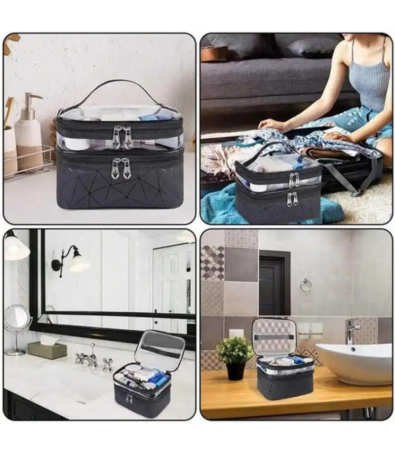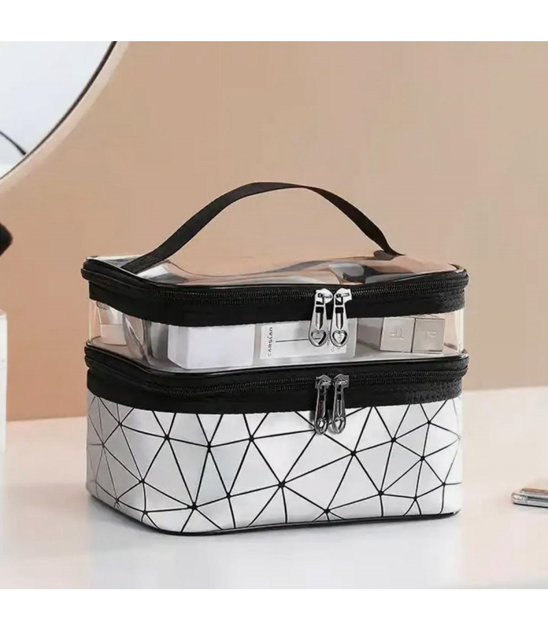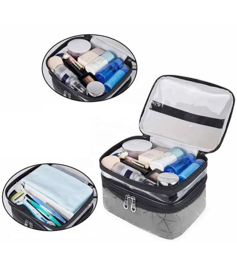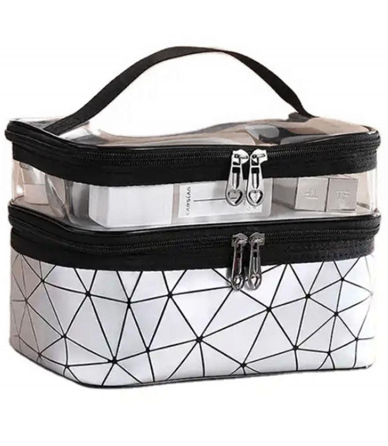 Niezwykle praktyczna kosmetyczka podróżna w formie kuferka. Wyposażona w wiele przegródek o zróżnicowanej wielkości i przeznaczeniu. Dodatkowe kieszenie i schowki ułatwią ukrycie ogromnej ilości kosmetyków. Kuferek został wykonany z solidnego tworzywa, które zabezpiecza zawartość przed przypadkowym uszkodzeniem. Etui posiada zamek błyskawiczny, przezroczystą pokrywkę oraz rączkę ułatwiająca jego wygodne przenoszenie.