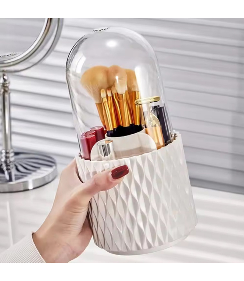 Niezwykle praktyczny, obrotowy organizer na pędzle i kosmetyki z pięcioma oddzielnymi przegródkami. Przezroczysta pokrywa umożliwia bieżący wgląd w zawartość organizera. Pojemnik doskonale nadaje się do przechowywania przyborów kosmetycznych które dotychczas zalegały w Twojej torebce bądź na biurku. Dzięki uniwersalnemu designowi dopasuje się do wnętrza każdego pomieszczenia.