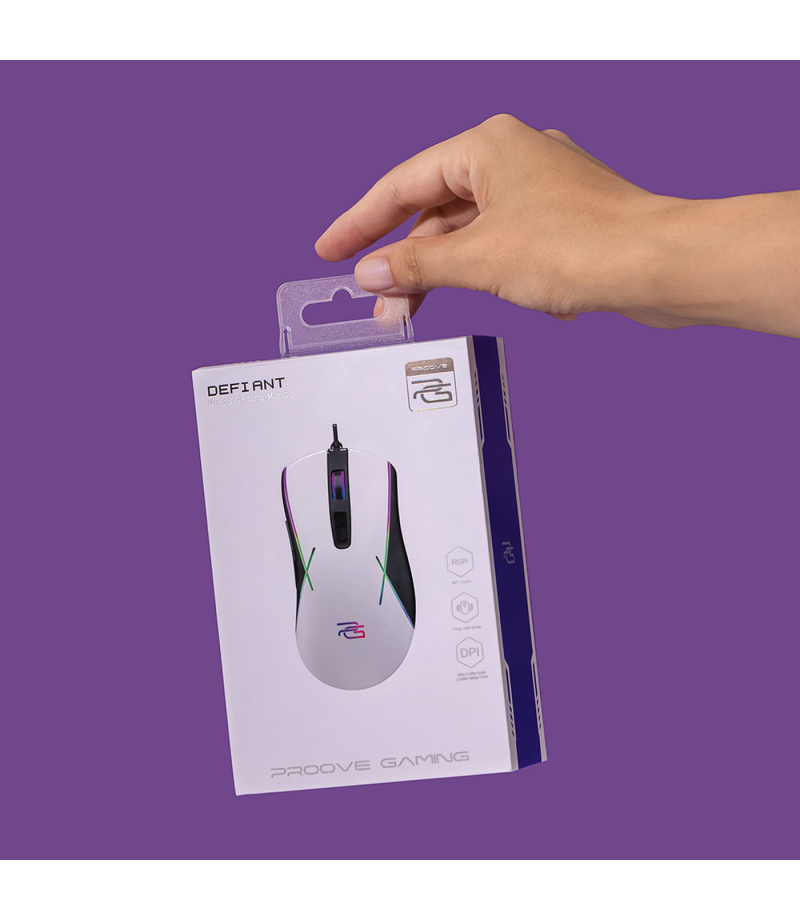 Proove mysz Gaming Defiant biała TFO GSM189032 Konstrukcja Mysz została wykonana z wytrzymałego plastiku ABS. Błyszcząca i matowa powierzchnia nadaje akcesorium stylowy wygląd. Połączony materiał jest wygodny w użyciu, mysz nie ślizga się w dłoni i dopasowuje się do kształtu dłoni. Dłoń nie będzie przeciążona podczas długich sesji grania. Mysz posiada 7 klawiszy typu Huano o żywotności 3 milionów naciśnięć....