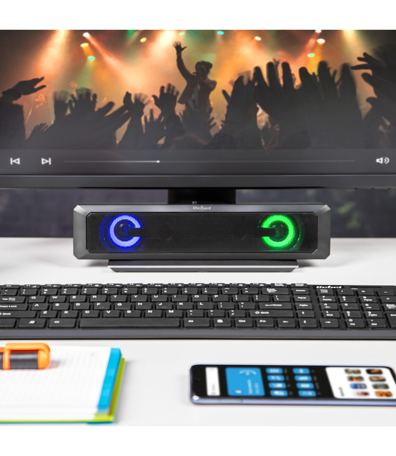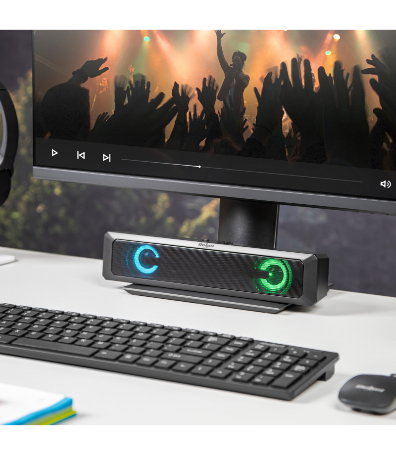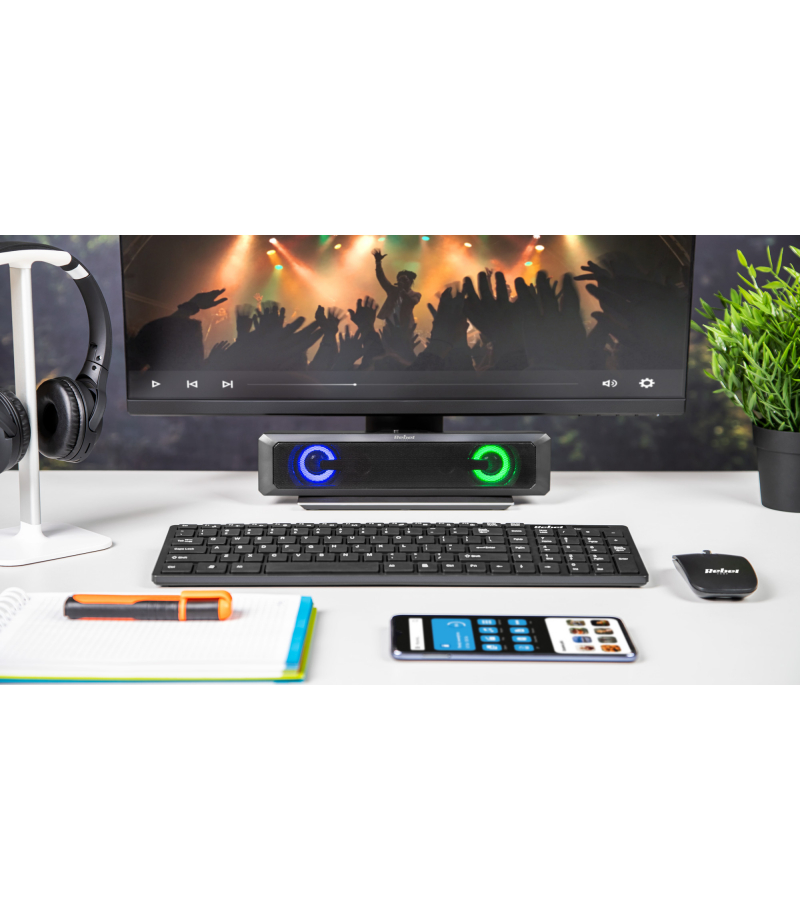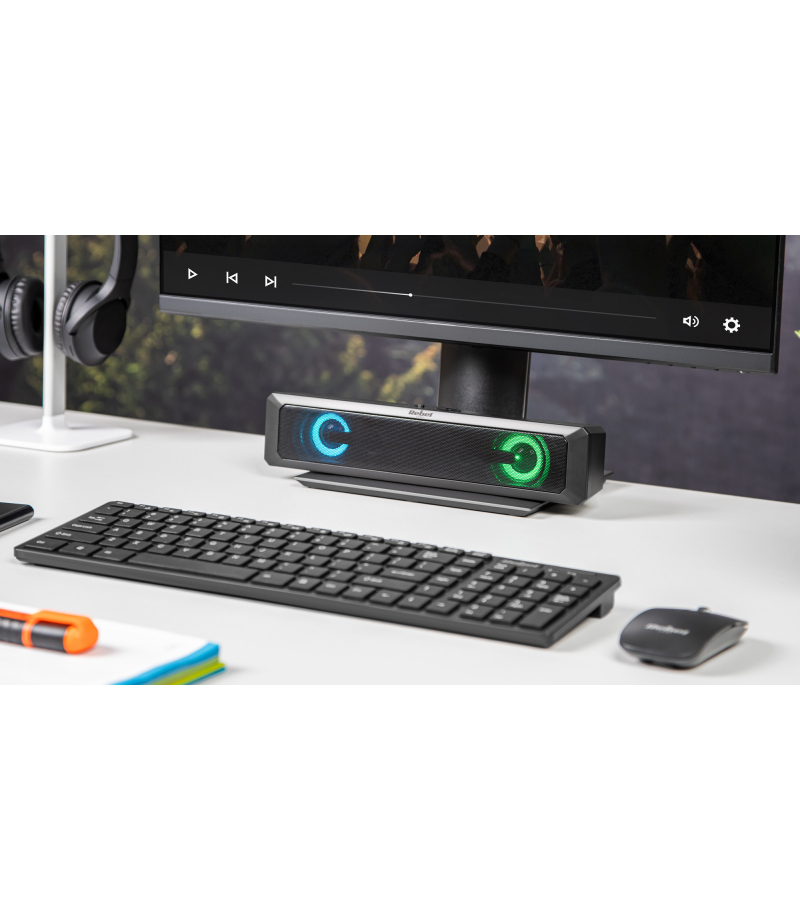 Kto powiedział, że komputerowy sprzęt audio musi składać się z co najmniej dwóch głośników? Jeśli na Twoim biurku nie ma wystarczająco dużo miejsca możesz wybrać soundbar komputerowy z serii Rebel Comp. Ten komputerowy głośnik został wyposażony w dwa przetworniki o mocy 3 W każdy, które uprzyjemnią codzienną pracę muzyką bądź umożliwią oglądanie filmów.Na uwagę zasługuje także sposób podłączenia – jest to głośnik do komputera na USB. Oznacza to, że nie wymaga dodatkowego zasilania sieciowego, więc możesz korzystać z niego nawet miejscu, gdzie nie ma dostępu do gniazdka. Co więcej, ma on także długi, bo aż 125-centymetrowy przewód, dlatego będziesz mógł ustawić mini soundbar w dowolnym miejscu. Głośnikiem komputerowym Rebel Comp z pewnością nie będą zawiedzeni Ci, którzy cenią estetykę. Urządzenie posiada stylową, czarną obudowę, a przetworniki są podświetlane na czerwono, co dodaje głośnikowi charakteru.