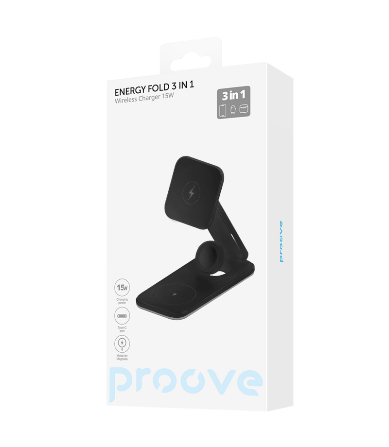 Proove ładowarka bezprzewodowa Energy Fold 3 w 1 czarna TFO GSM189066 Magnetic Energy Fold ładuje trzy urządzenia jednocześnie (zegarek, słuchawki, smartfon) bez utraty mocy. Posiada trzy różne punkty styku. Materiał: Wykonany z tworzywa sztucznego i aluminium, zapewniając minimalistyczny i nowoczesny design. Prąd wejściowy: 5V/3A, 9V/2A. Moc wyjściowa: Zegarek 5W, słuchawki 2,5W, smartfon 15W. Ochrona: System ochrony przed wysokim napięciem, przegrzaniem, zwarciem,...