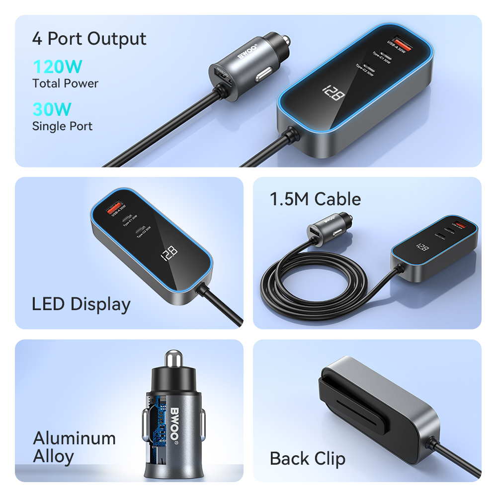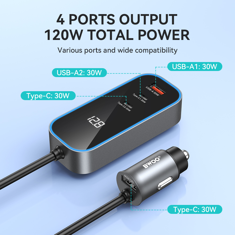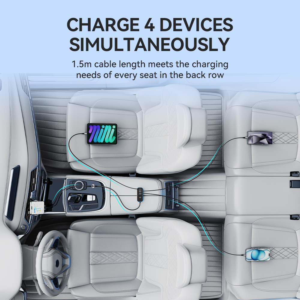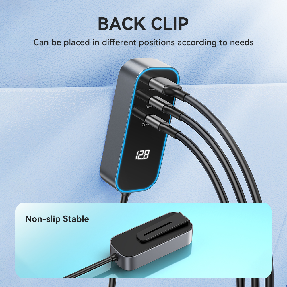 Ładowarka samochodowa USB-C Multi-Port 120W oferuje łączną moc 120W, umożliwiając jednoczesne szybkie ładowanie aż czterech urządzeń – zapewniając efektywne zasilanie dla wszystkich pasażerów w podróży. Dzięki 1,5-metrowemu przewodowi, pasażerowie z tyłu mogą wygodnie podłączyć aż trzy urządzenia, co czyni ją idealnym rozwiązaniem na rodzinne wyjazdy lub wspólne dojazdy. Zintegrowany antypoślizgowy klips oraz dwustronne mocowanie zatrzaskowe zapewniają stabilne umiejscowienie nawet na wyboistych drogach, a dynamiczne podświetlenie RGB dodaje wnętrzu auta nowoczesnego stylu. Wbudowany wyświetlacz LED napięcia umożliwia bieżące monitorowanie stanu ładowania, a zaawansowany system zabezpieczeń automatycznie odcina zasilanie w przypadku przegrzania lub przeciążenia, chroniąc zarówno urządzenia, jak i pasażerów.