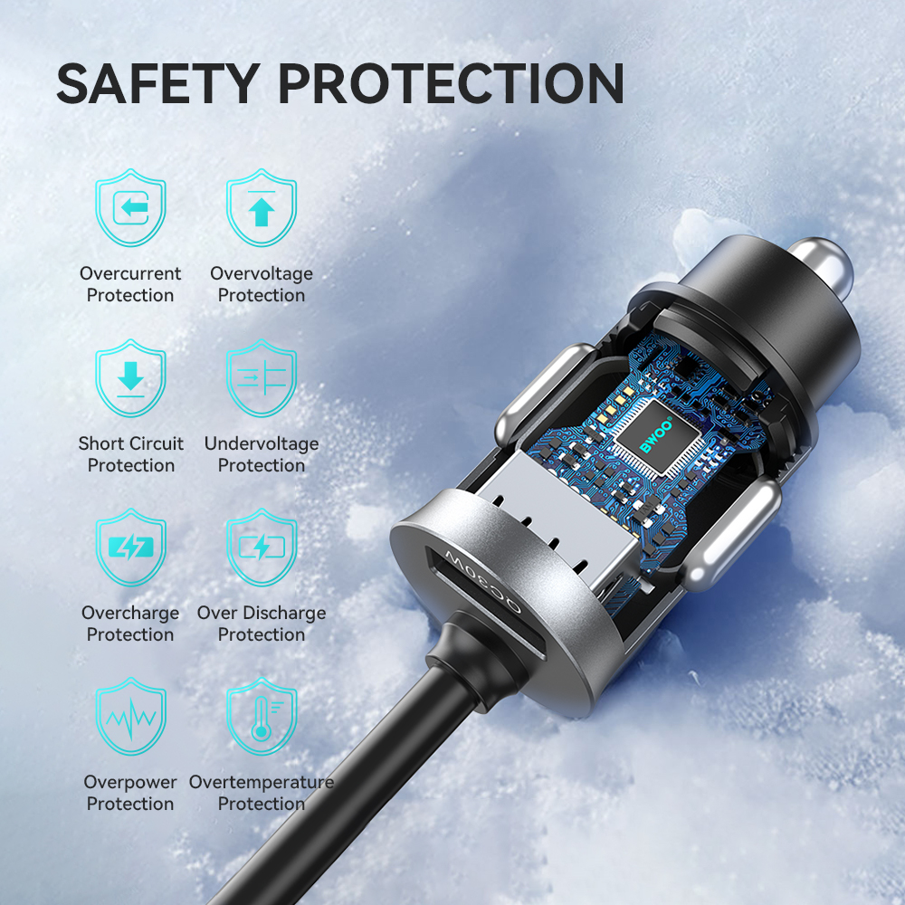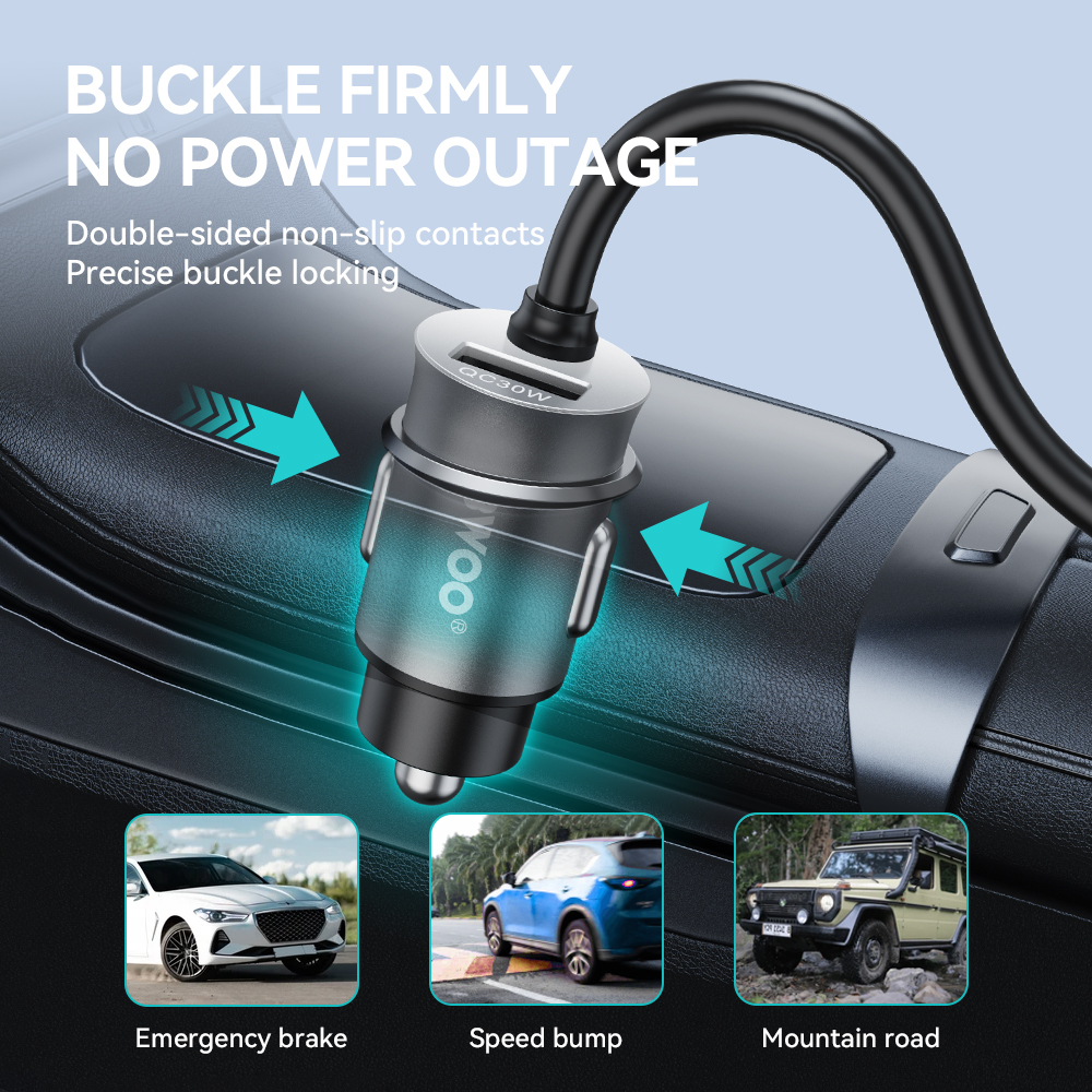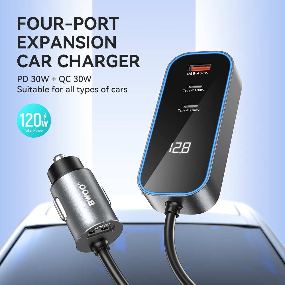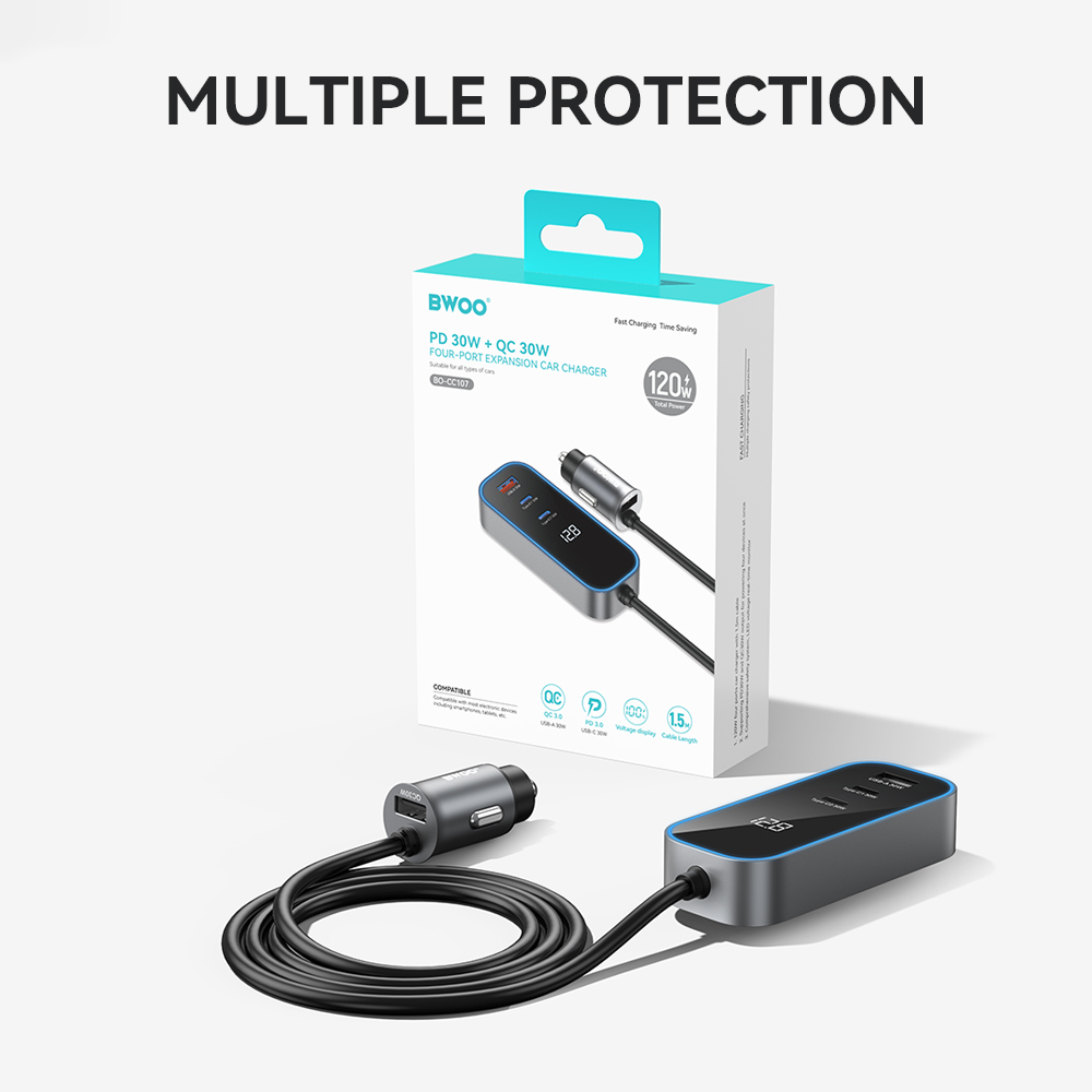 Ładowarka samochodowa USB-C Multi-Port 120W oferuje łączną moc 120W, umożliwiając jednoczesne szybkie ładowanie aż czterech urządzeń – zapewniając efektywne zasilanie dla wszystkich pasażerów w podróży. Dzięki 1,5-metrowemu przewodowi, pasażerowie z tyłu mogą wygodnie podłączyć aż trzy urządzenia, co czyni ją idealnym rozwiązaniem na rodzinne wyjazdy lub wspólne dojazdy. Zintegrowany antypoślizgowy klips oraz dwustronne mocowanie zatrzaskowe zapewniają stabilne umiejscowienie nawet na wyboistych drogach, a dynamiczne podświetlenie RGB dodaje wnętrzu auta nowoczesnego stylu. Wbudowany wyświetlacz LED napięcia umożliwia bieżące monitorowanie stanu ładowania, a zaawansowany system zabezpieczeń automatycznie odcina zasilanie w przypadku przegrzania lub przeciążenia, chroniąc zarówno urządzenia, jak i pasażerów.