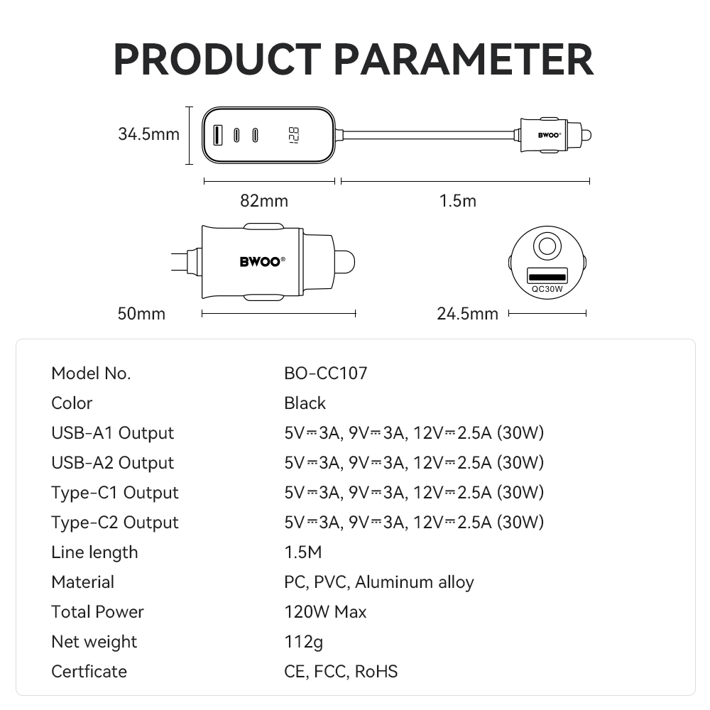BWOO ładowarka samochodowa PD RGB CC107 1x USB-C 1x USB 30W czarna TFO GSM191510 Ładowarka samochodowa USB-C Multi-Port 120W oferuje łączną moc 120W, umożliwiając jednoczesne szybkie ładowanie aż czterech urządzeń – zapewniając efektywne zasilanie dla wszystkich pasażerów w podróży. Dzięki 1,5-metrowemu przewodowi, pasażerowie z tyłu mogą wygodnie podłączyć aż trzy urządzenia, co czyni ją idealnym rozwiązaniem na rodzinne wyjazdy lub wspólne dojazdy. Zintegrowany...