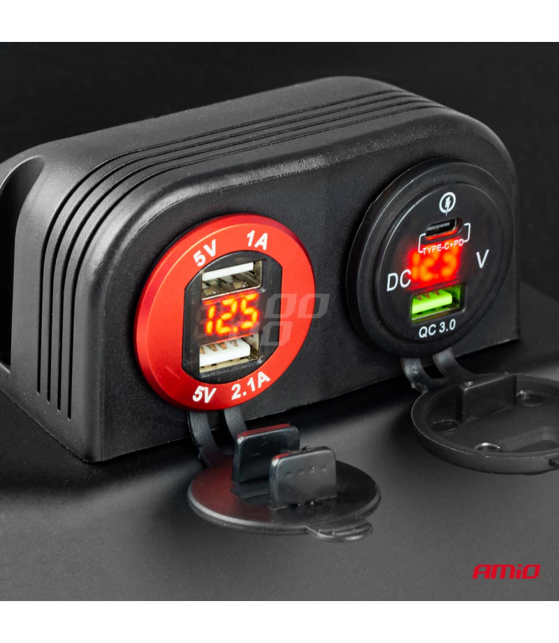 Wodoodporna ładowarka z gniazdami USB i testerem napięcia + USB-C 12V 24V MOD-07 AMIO-02857 Zastosowanie: motocykle, quady, łodzie, skutery, kampery, samochody osobowe oraz samochody ciężarowe, ciągniki i wiele innych Kolor podświetlenia - czerwony Ładowarka z portem USB szybkiego ładowania QC3.0 oraz portem USB-C PD 18W. Zestaw umożliwia jednoczesne korzystanie z obu gniazd. Cyfrowy...