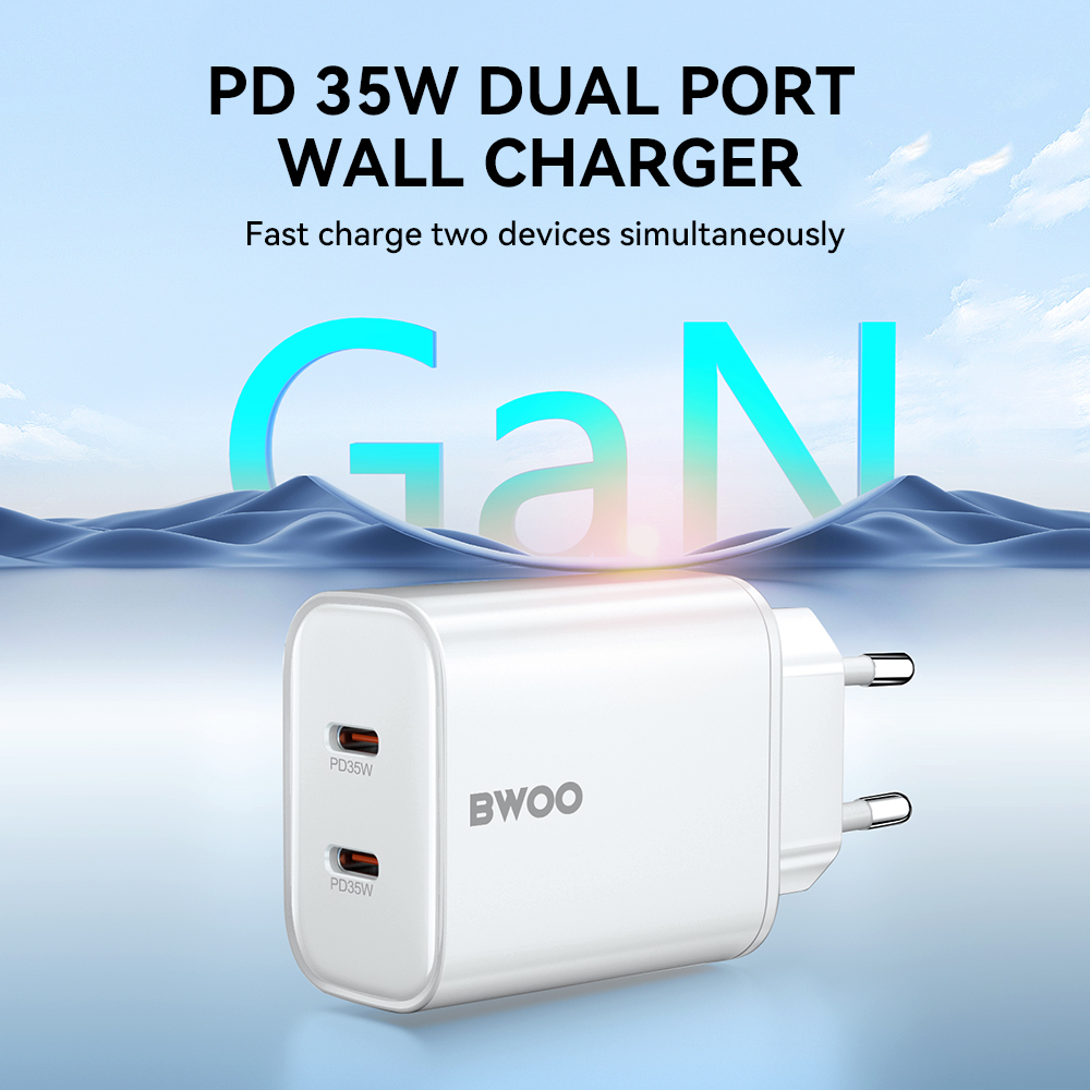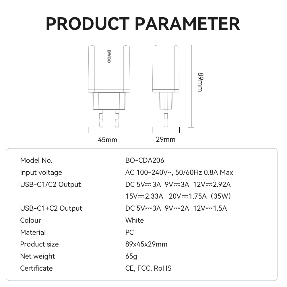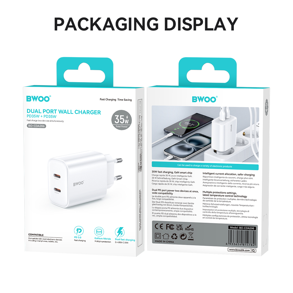 BWOO ładowarka sieciowa PD CDA206 USB-C 35W biały TFO GSM191508 Ładowarka Dual USB-C 35W (2 w 1) zapewnia łączną moc wyjściową 35W, umożliwiając szybkie ładowanie dwóch urządzeń jednocześnie – idealna dla iPhone’ów, telefonów z Androidem, tabletów i akcesoriów USB-C. Inteligentne rozdzielanie mocy zapewnia zbalansowane ładowanie 18W na port, gdy oba są używane, co sprawdza się u użytkowników multitaskujących lub w rodzinach. Szeroka kompatybilność z protokołami...