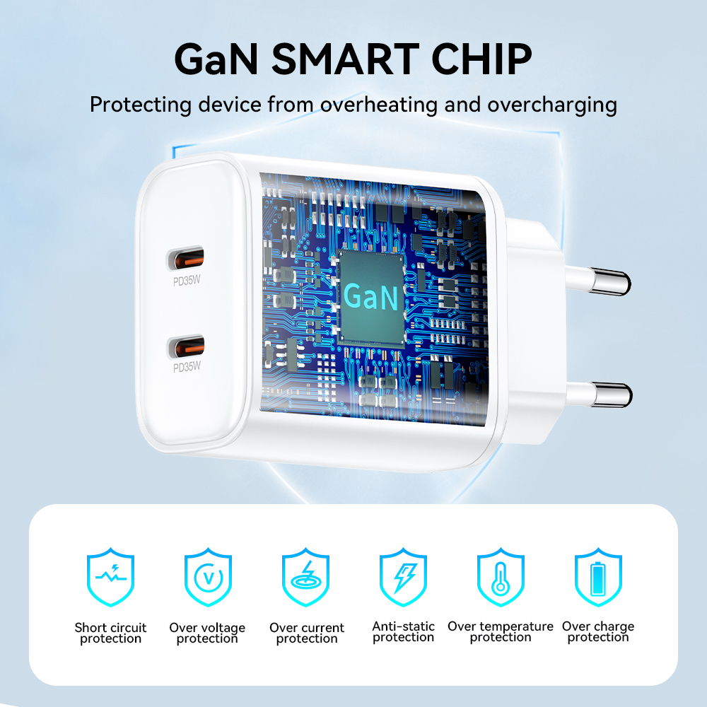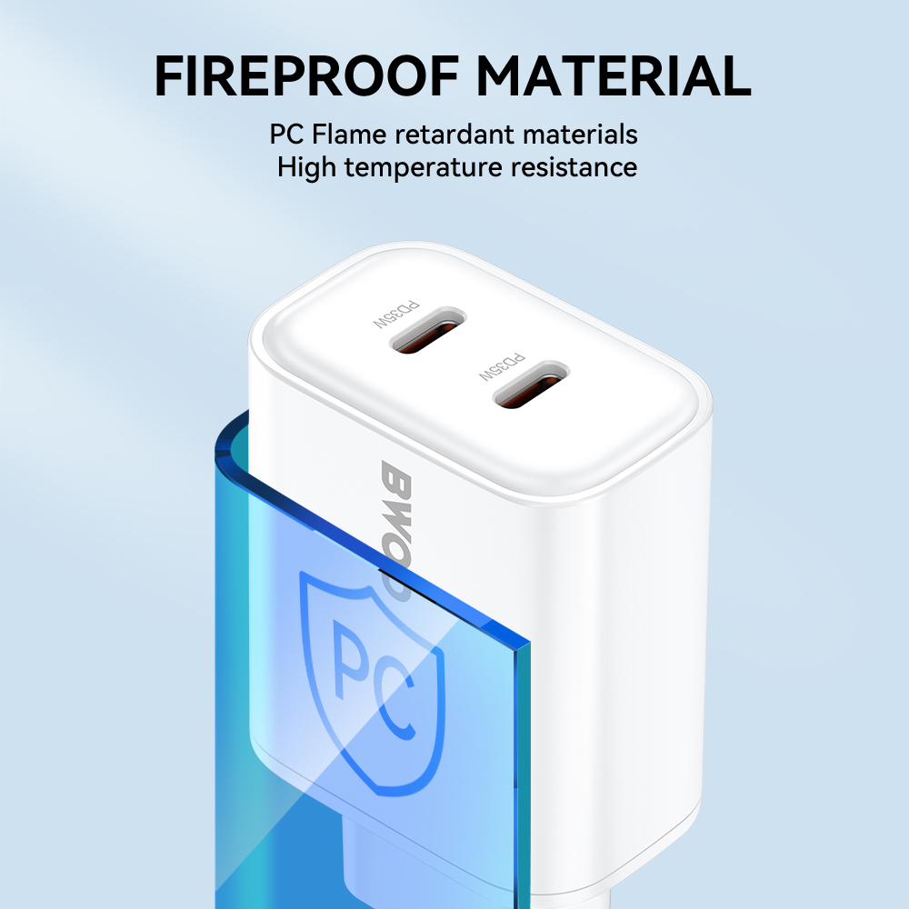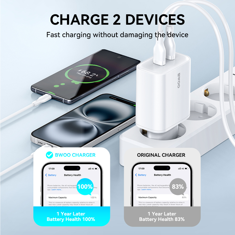 Ładowarka Dual USB-C 35W (2 w 1) zapewnia łączną moc wyjściową 35W, umożliwiając szybkie ładowanie dwóch urządzeń jednocześnie – idealna dla iPhone’ów, telefonów z Androidem, tabletów i akcesoriów USB-C. Inteligentne rozdzielanie mocy zapewnia zbalansowane ładowanie 18W na port, gdy oba są używane, co sprawdza się u użytkowników multitaskujących lub w rodzinach. Szeroka kompatybilność z protokołami USB-PD, QC, FCP i SCP wspiera ładowanie iPhone 15/16, urządzeń z Androidem i innych – a uniwersalne napięcie 100–240V czyni ją idealną do podróży. Podwójne układy ochronne zabezpieczają przed przegrzaniem, przepięciem i zwarciem, zapewniając bezpieczne i niezawodne ładowanie za każdym razem.