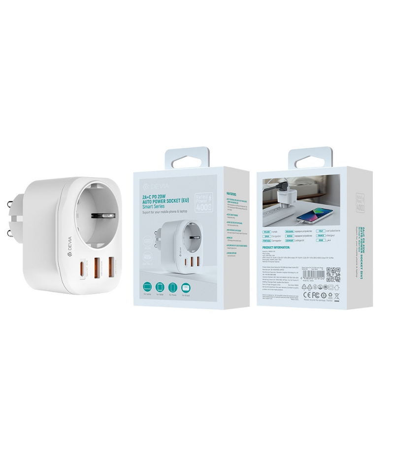 Devia gniazdo sieciowe ładowarka Smart PD 20W 1x USB-C 2x USB biała TFO BRA013534 Jedno urządzenie i wiele portów ładowania? Gniazdo elektryczne od Devi wyposażone jest w 3 porty do ładowania: 2x USB i 1x USB-C , co umożłiwa wygodne ładowanie kilku urządzeń jednocześnie. Urządzenie jest niewielkiego rozmiaru, świetnie sprawdzi się w podróży czy domowym biurze. Wysoka jakość wykonania gwarantuje niezawodne działanie przez długi czas...