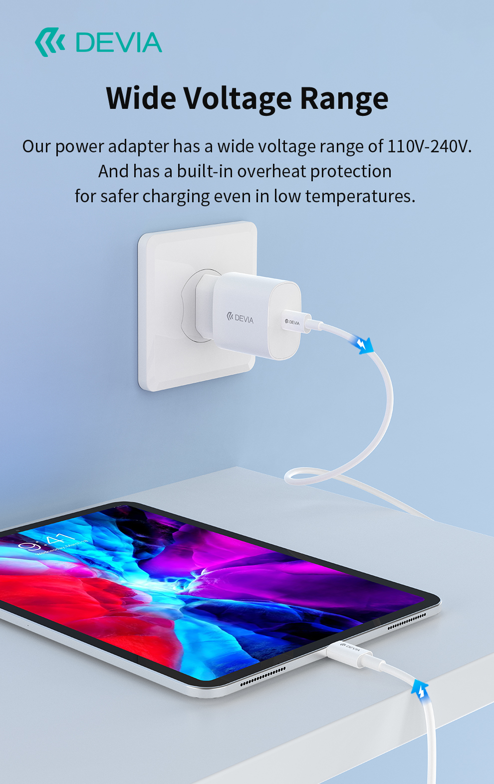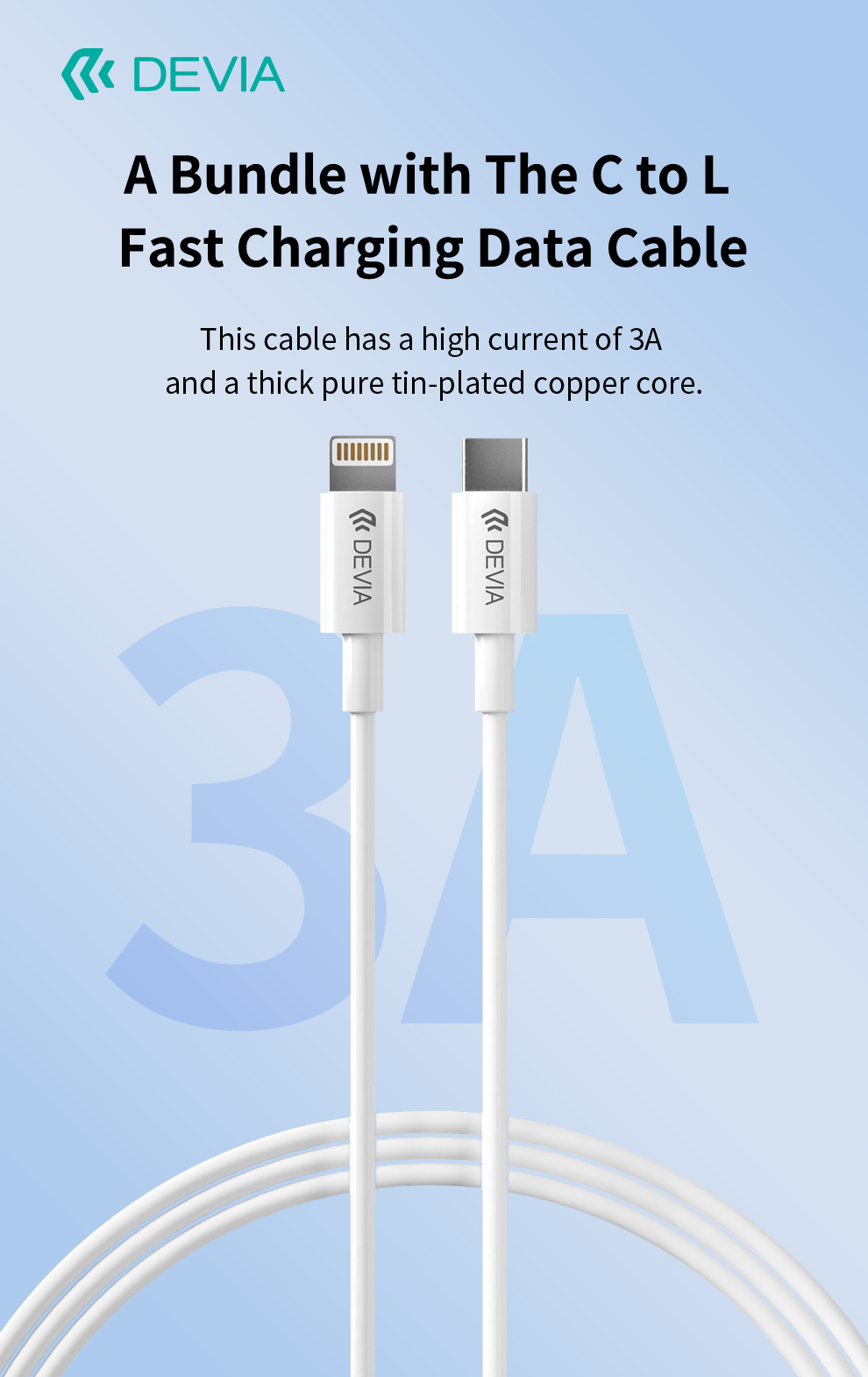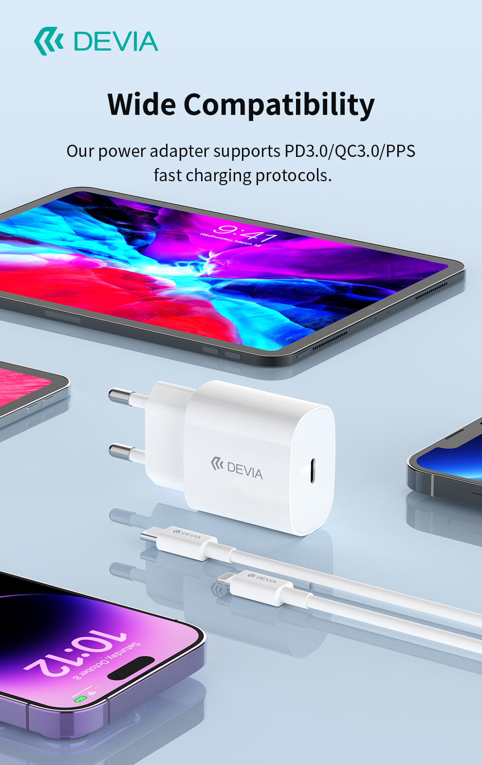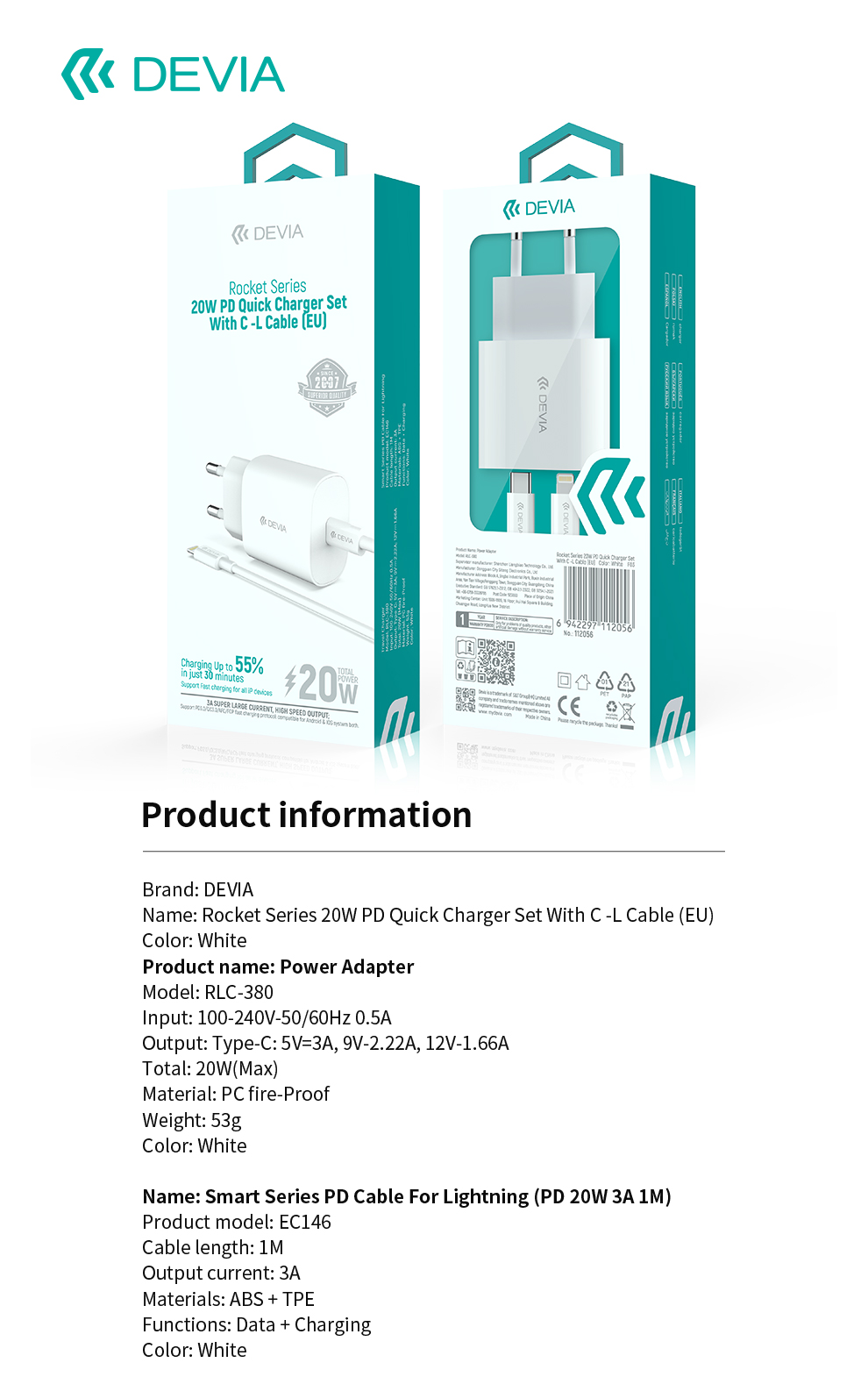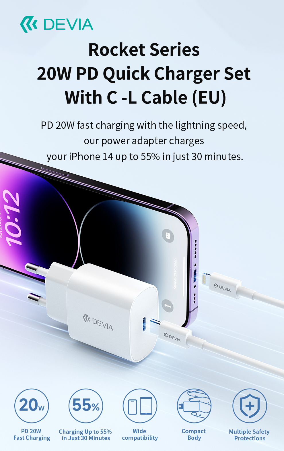 Devia ładowarka sieciowa Rocket PD 20W 1x USB-C biała + kabel USB-C - Lightning TFO BRA014305 Małe rozmiary potężna moc! Ładowarka sieciowa od Devi jest niewielkich rozmiarów o mocy 20 W w techologii GaN. Wykonana z trwałych materiałów, jest lekka i wytrzymała . Jakością dorównuje do oryginalnym akcesoriom od znanych producentów jak Apple czy Samsung....