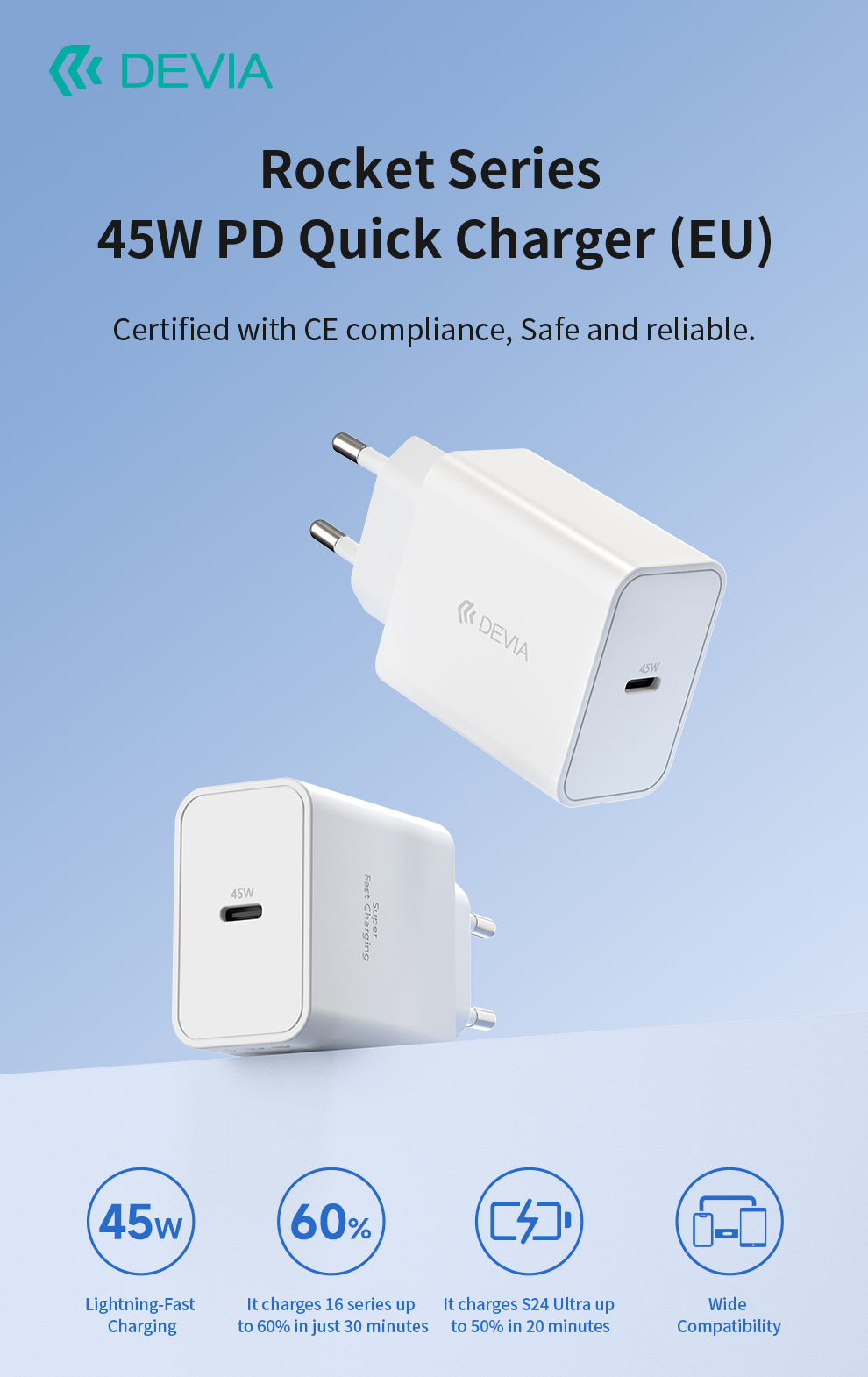 Wydajność i elegancja w jednym! Devia Rocket PD 45W to kompaktowa ładowarka sieciowa z portem USB-C, stworzona z myślą o nowoczesnych użytkownikach. Obsługuje technologię Power Delivery, dzięki czemu zapewnia szybkie i bezpieczne ładowanie smartfonów, tabletów, a nawet ultrabooków. Jej minimalistyczna, biała obudowa doskonale pasuje do każdego wnętrza i idealnie sprawdza się w domu, biurze lub w podróży.