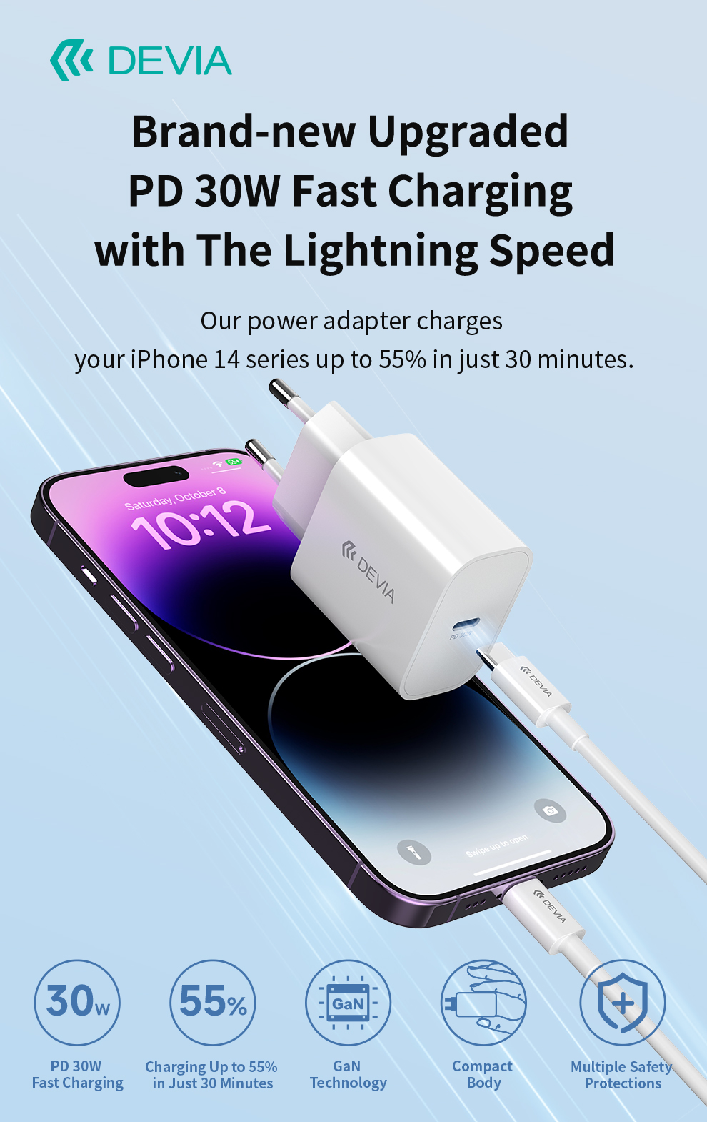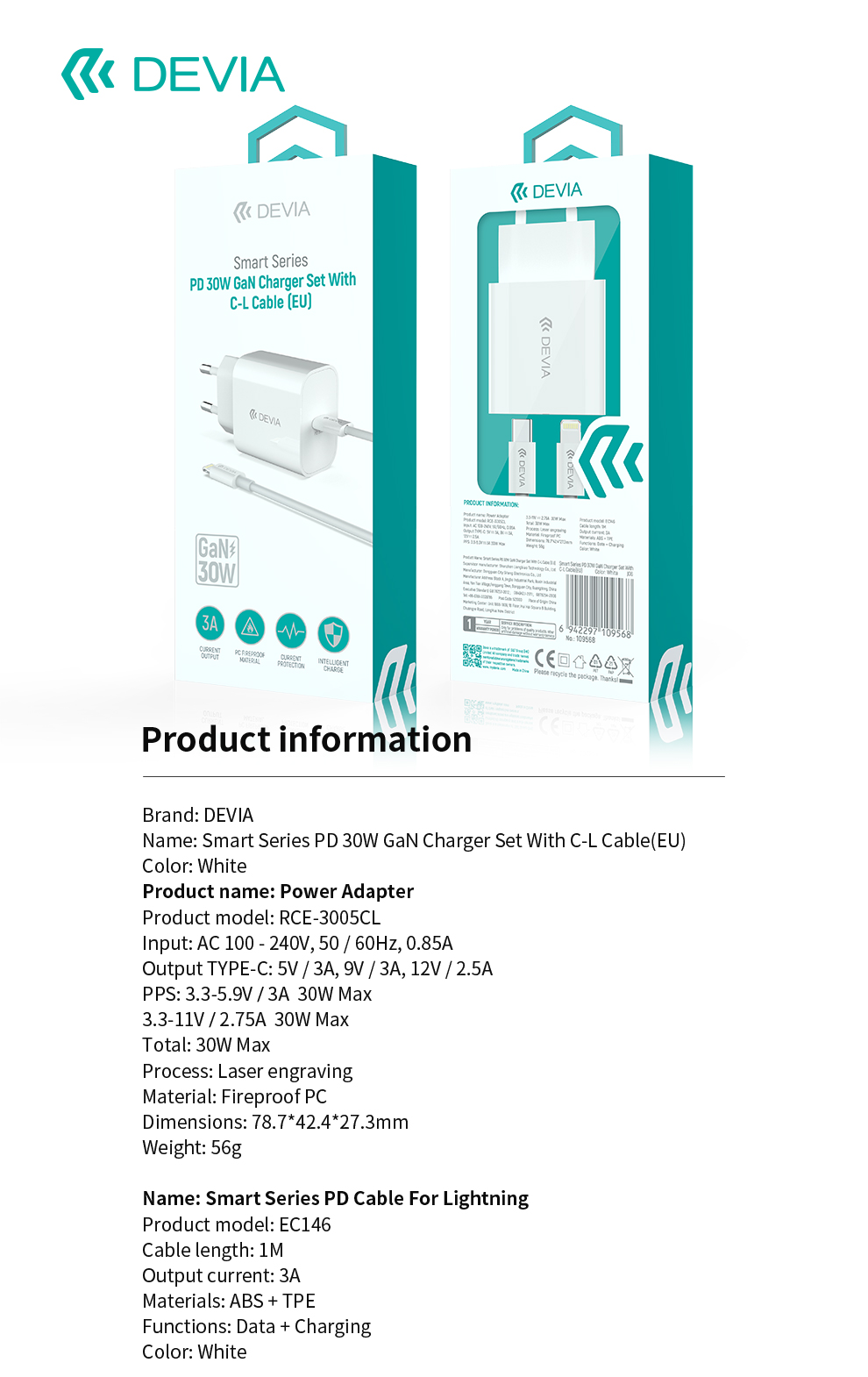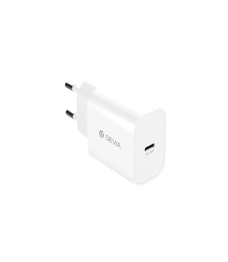 Devia ładowarka sieciowa Smart PD GaN 30W 1x USB-C biała + kabel USB-C - Lightning TFO BRA014308 Ładowarka o mocy 30 W w zestawie z kabem 3 A USB-C - Lightning o długości 1 m (ładowanie oraz transmisja danch) z technologią GaN. Wspiera ładowanie smartfonów, słuchawek, tabletów i innych urządzeń dostępnych na rynku. Rozmiar ładowarki jest niewielki. Ładowarka jest trwała, zachwyca...