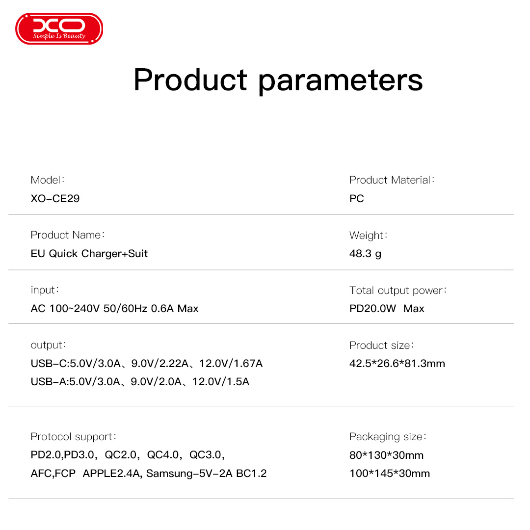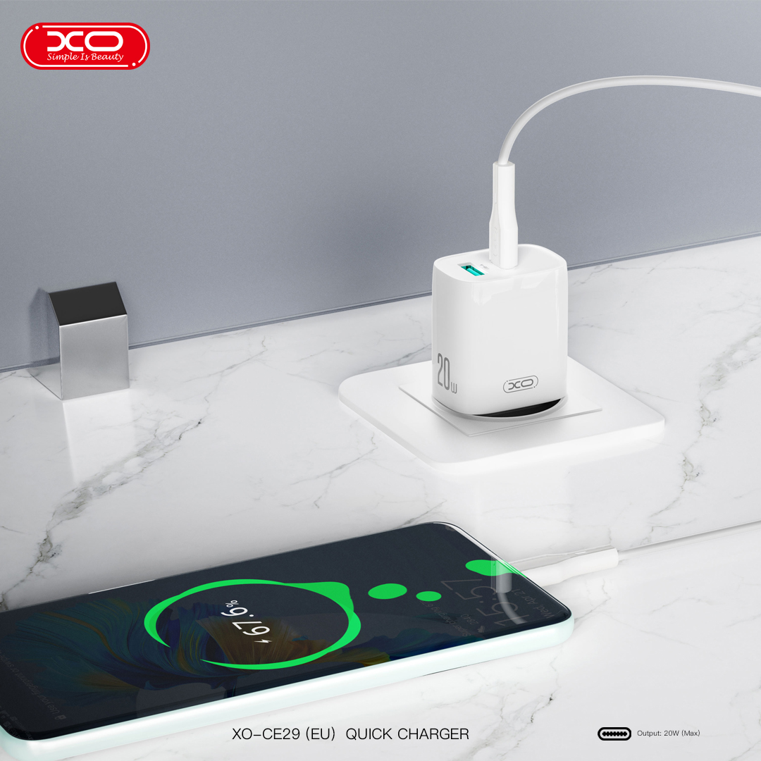 XO CE29 to zaawansowana ładowarka sieciowa o mocy 20W wyposażona w dwa gniazda jedno to USB QC i drugie USB-C PD. Zapewnia wystarczającą ilość energii do szybkiego ładowania nawet największych dostępnych urządzeń mobilnych. Klasyczny wygląd pasuje do wszystkich rodzajów wnętrz a jakość wykonania wskazuje, że jest to urządzenie solidne i trwałe.