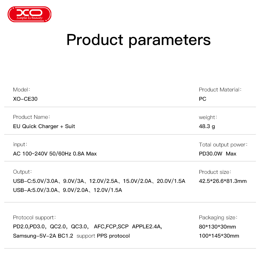 XO CE30 to zaawansowana ładowarka sieciowa o mocy 30W wyposażona w dwa gniazda jedno to USB QC i drugie USB-C PD. Zapewnia wystarczającą ilość energii do szybkiego ładowania nawet największych dostępnych urządzeń mobilnych. Klasyczny wygląd pasuje do wszystkich rodzajów wnętrz a jakość wykonania wskazuje, że jest to urządzenie solidne i trwałe.
